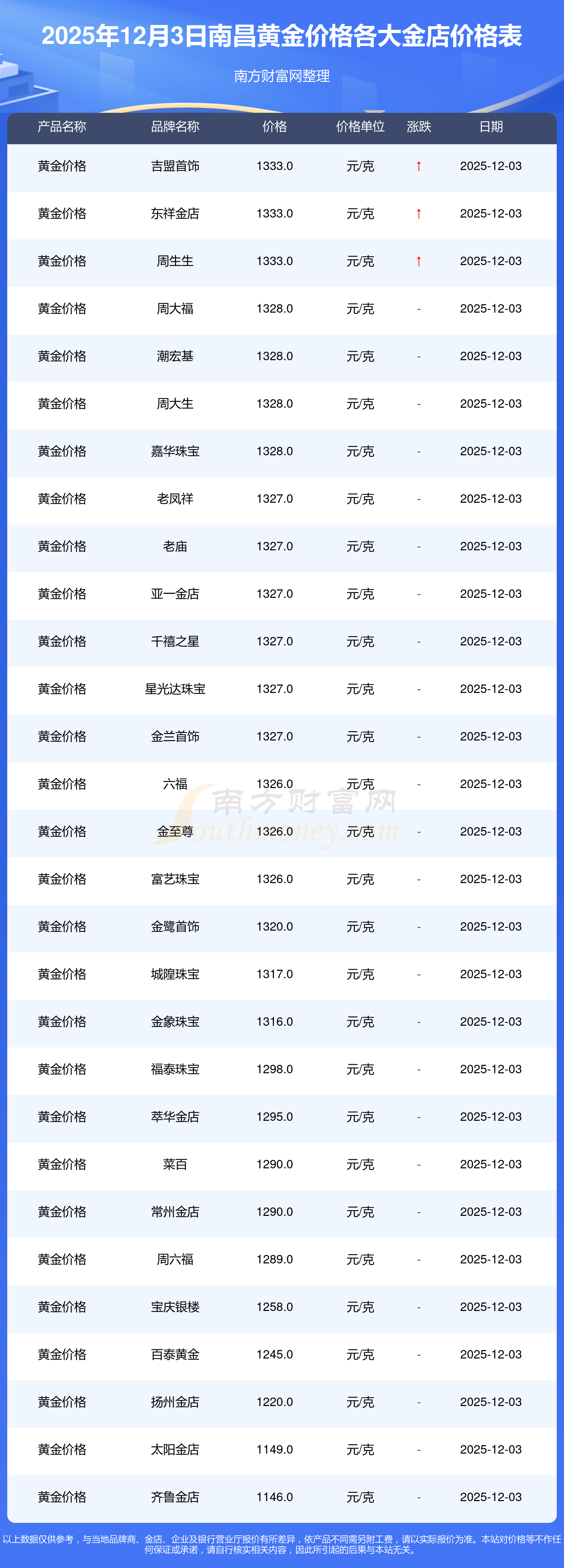 2025年12月3日南昌周大福、周大福、周大福、周大福、周大福、周大福、周大福、老鳳祥、老鳳祥、老鳳祥、六福等各大金店品牌黃金價(jià)格最新價(jià)格如下:周大福黃金價(jià)格1328.0元/克,周大福鉑金價(jià)格663.0元/克,周大福飾品金價(jià)(內(nèi)地)1328.0元/克,周大福黃金飾品(香港)46770.0,周大福鉑金價(jià)格(香港)18990.0,周大福金條價(jià)格(香港)42190.0,周大福金條金價(jià)(內(nèi)地)1165.0元/克,老鳳祥黃金價(jià)格1327.0元/克,老鳳祥鉑金價(jià)格600.0元/克,老鳳祥足金價(jià)格1327.0元/克,六福黃金價(jià)格1326.0元/克。