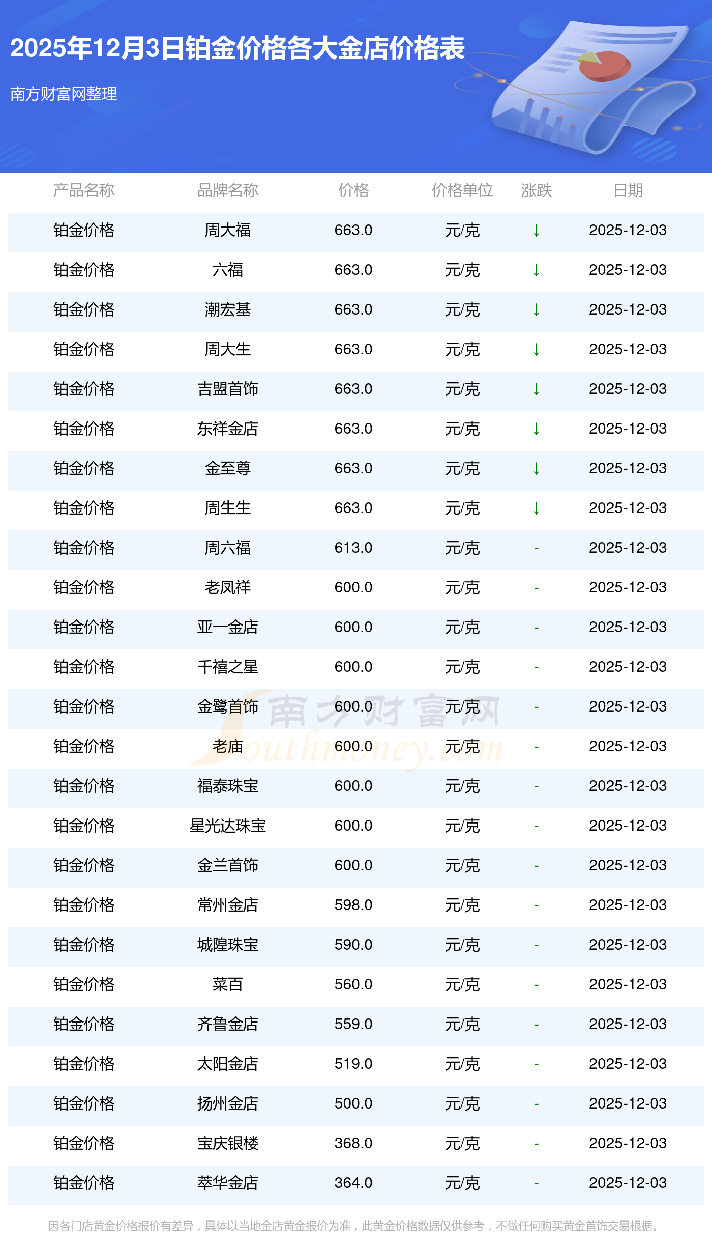 今天是2025年12月3日,周大福、周大福、周大福、周大福、周大福、周大福、周大福、老鳳祥、老鳳祥、老鳳祥、六福等各大金店品牌鉑金價格最新價格如下:周大福1328.0元/克、周大福663.0元/克、周大福1328.0元/克、周大福46770.0、周大福18990.0、周大福42190.0、周大福1165.0元/克、老鳳祥1327.0元/克、老鳳祥600.0元/克、老鳳祥1327.0元/克、六福1326.0元/克。