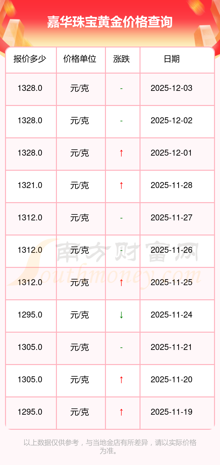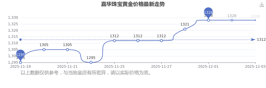 今日嘉華珠寶 黃金價格最新的克重售價為1328.0元/克。