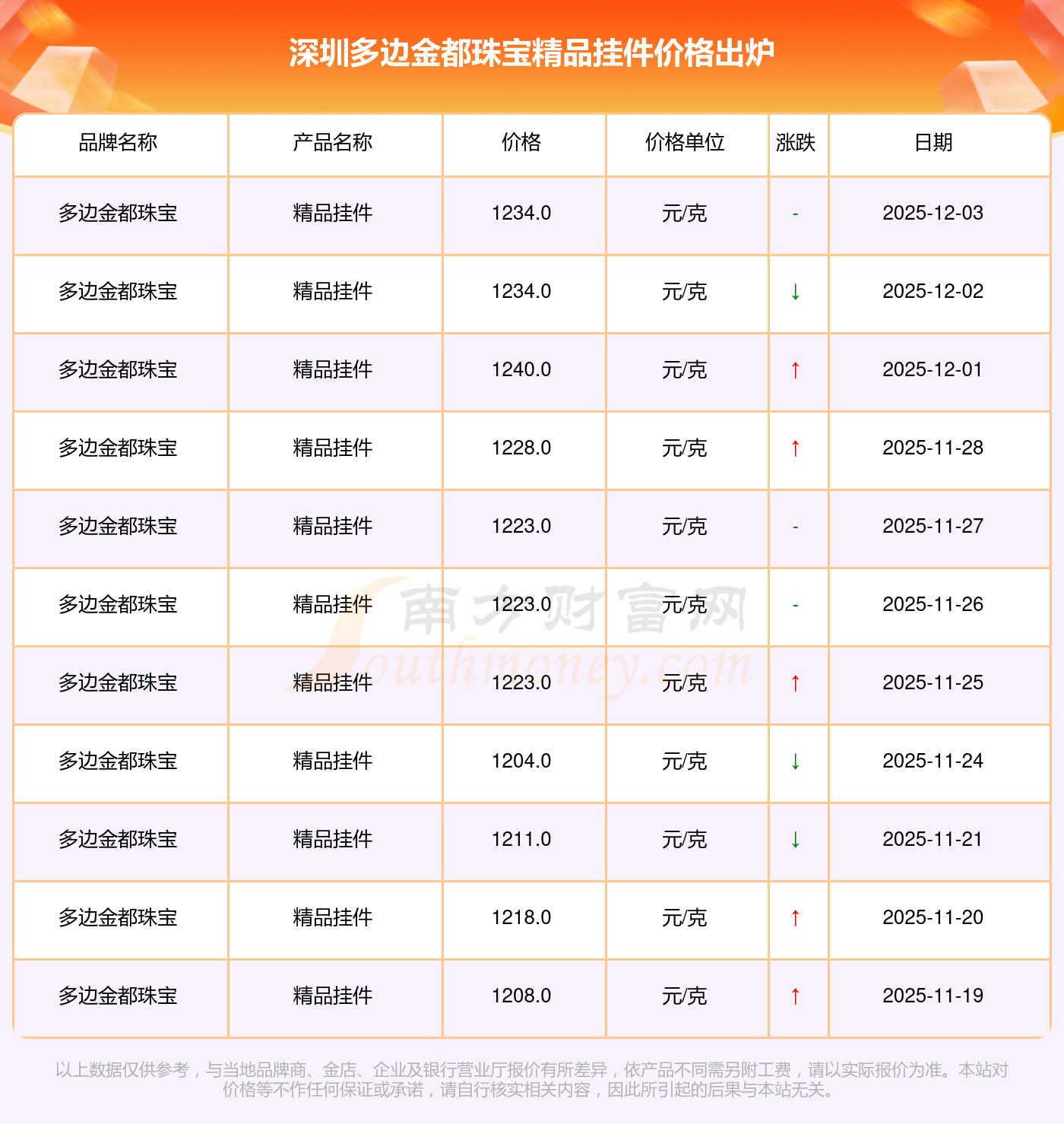 深圳多邊金都珠寶 2025年12月3日的精品掛件價(jià)位為 1234.0元/克。