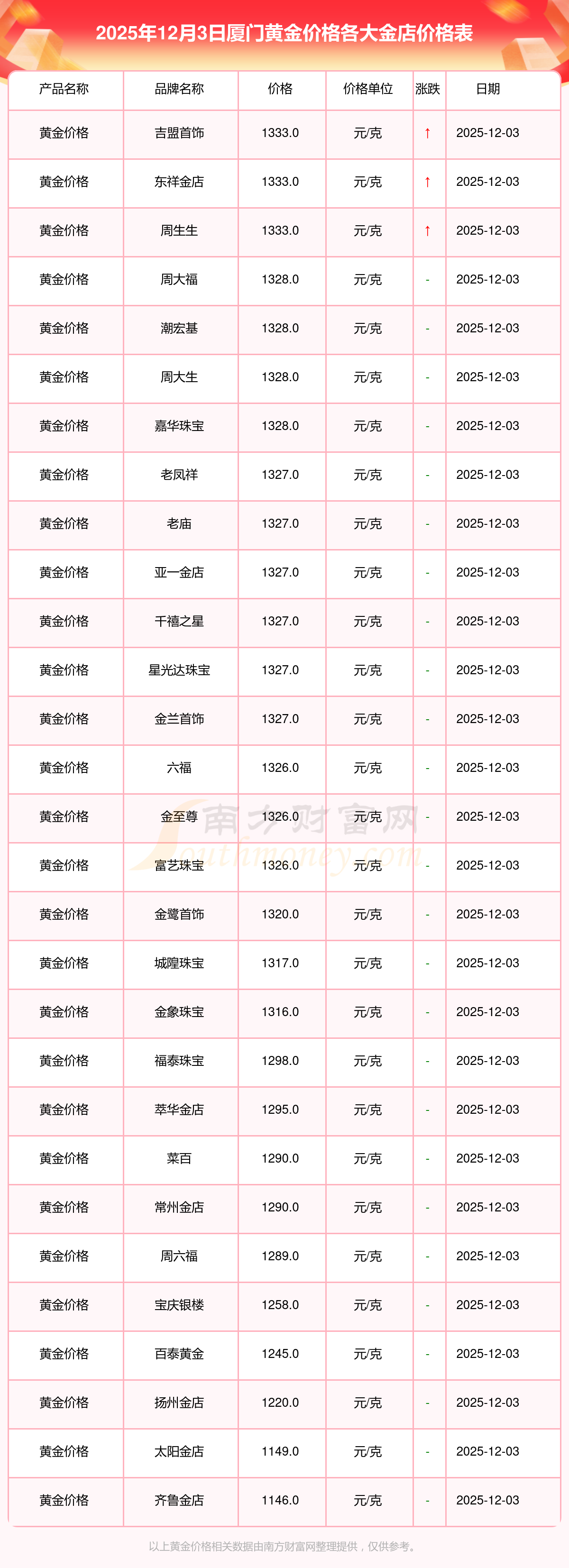 今天是2025年12月3日,廈門周大福、周大福、周大福、周大福、周大福、周大福、周大福、老鳳祥、老鳳祥、老鳳祥、六福等各大金店品牌黃金價格最新價格如下:周大福1328.0元/克、周大福663.0元/克、周大福1328.0元/克、周大福46770.0、周大福18990.0、周大福42190.0、周大福1165.0元/克、老鳳祥1327.0元/克、老鳳祥600.0元/克、老鳳祥1327.0元/克、六福1326.0元/克。