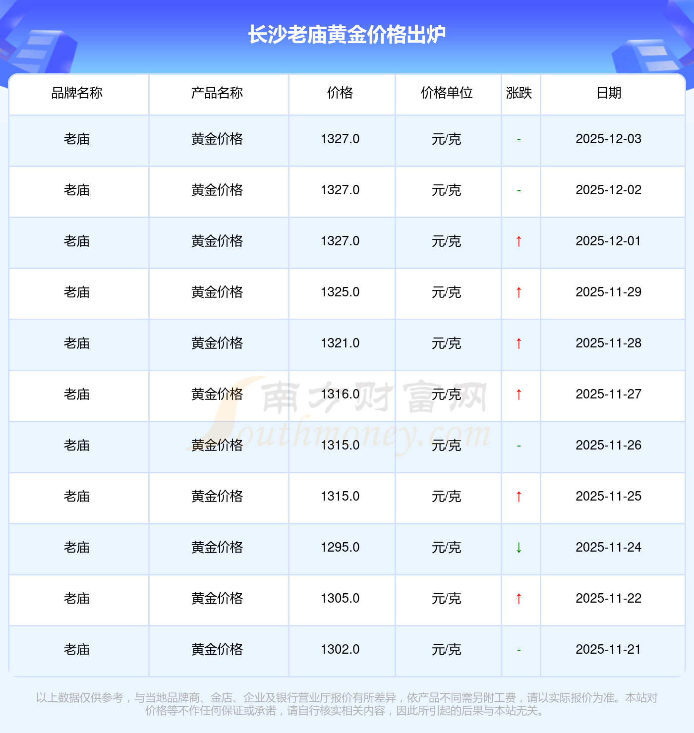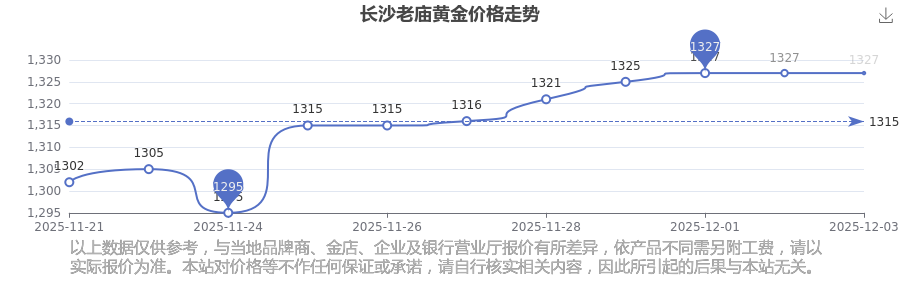 今日(2025年12月3日),長沙老廟黃金價格每克的價值為1327.0元/克。