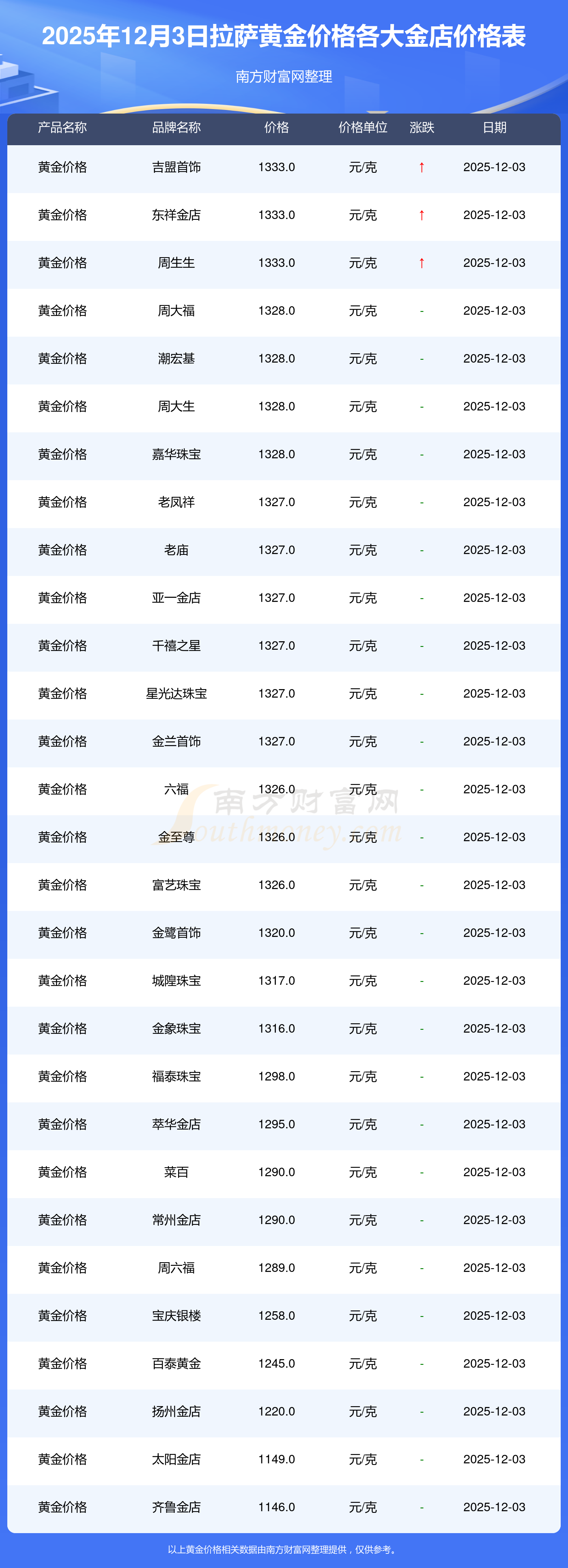 2025年12月3日,拉薩周大福、周大福、周大福、周大福、周大福、周大福、周大福、老鳳祥、老鳳祥、老鳳祥、六福等各大金店品牌黃金價格今日價格如下:周大福1328.0元/克、周大福663.0元/克、周大福1328.0元/克、周大福46770.0、周大福18990.0、周大福42190.0、周大福1165.0元/克、老鳳祥1327.0元/克、老鳳祥600.0元/克、老鳳祥1327.0元/克、六福1326.0元/克。