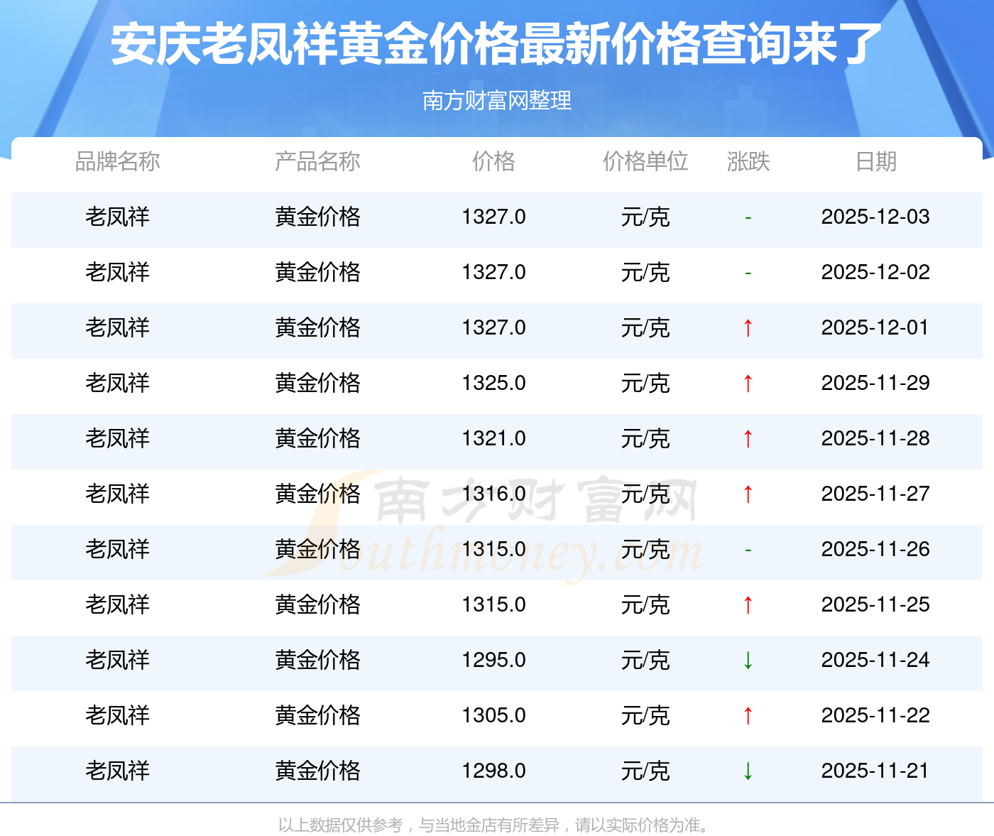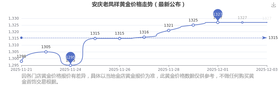 今日(2025年12月3日),安慶老鳳祥黃金價(jià)格每克的價(jià)值為1327.0元/克。