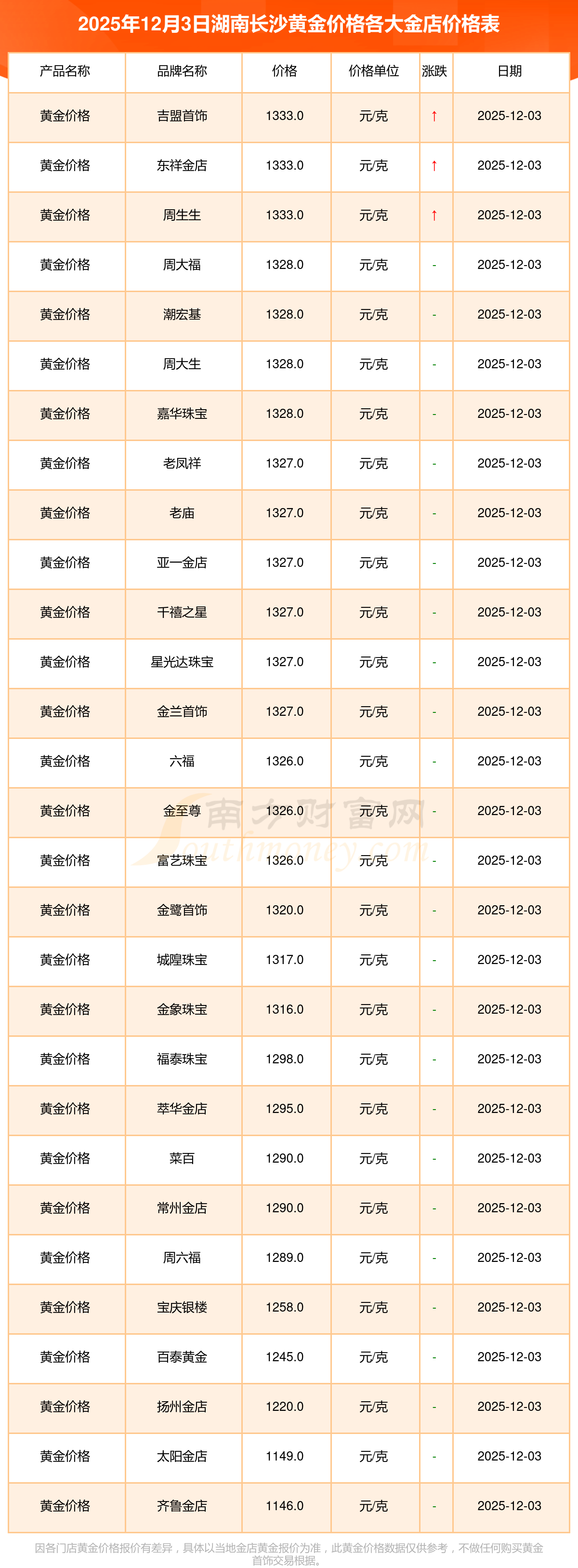 2025年12月3日,湖南長沙周大福、周大福、周大福、周大福、周大福、周大福、周大福、老鳳祥、老鳳祥、老鳳祥、六福等各大金店品牌黃金價格今日價格行情最新來了:周大福1328.0元/克、周大福663.0元/克、周大福1328.0元/克、周大福46770.0、周大福18990.0、周大福42190.0、周大福1165.0元/克、老鳳祥1327.0元/克、老鳳祥600.0元/克、老鳳祥1327.0元/克、六福1326.0元/克。