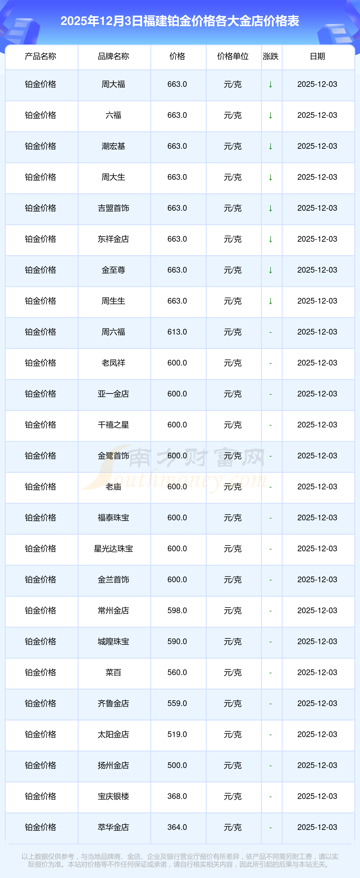 2025年12月3日福建各大金店鉑金價(jià)格最新價(jià)格:周大福1328.0元/克,周大福663.0元/克,周大福1328.0元/克,周大福46770.0,周大福18990.0,周大福42190.0,周大福1165.0元/克,老鳳祥1327.0元/克,老鳳祥600.0元/克,老鳳祥1327.0元/克,六福1326.0元/克。