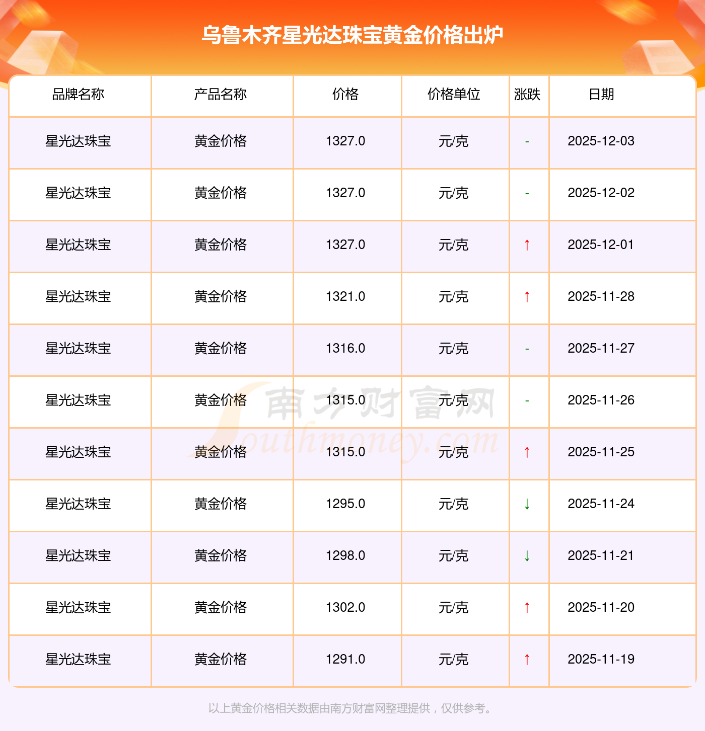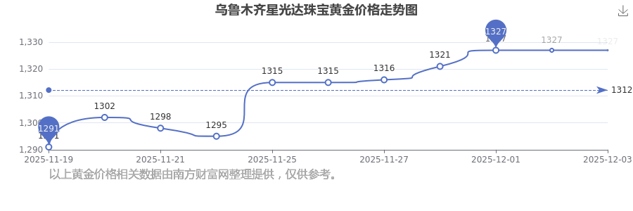 2025年12月3日,烏魯木齊星光達(dá)珠寶所售黃金價(jià)格,其價(jià)格設(shè)定為 1327.0元/克。