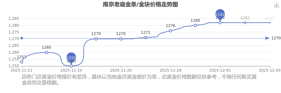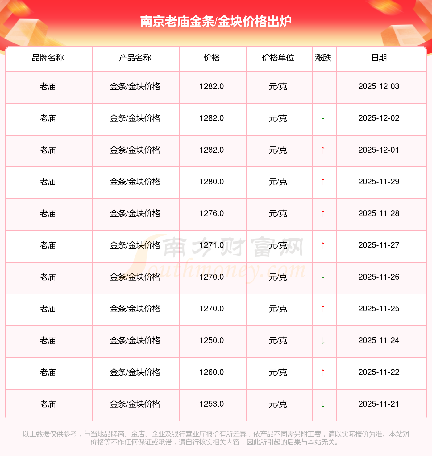 今日(2025年12月3日),南京老廟金條/金塊價格每克的價值為1282.0元/克。