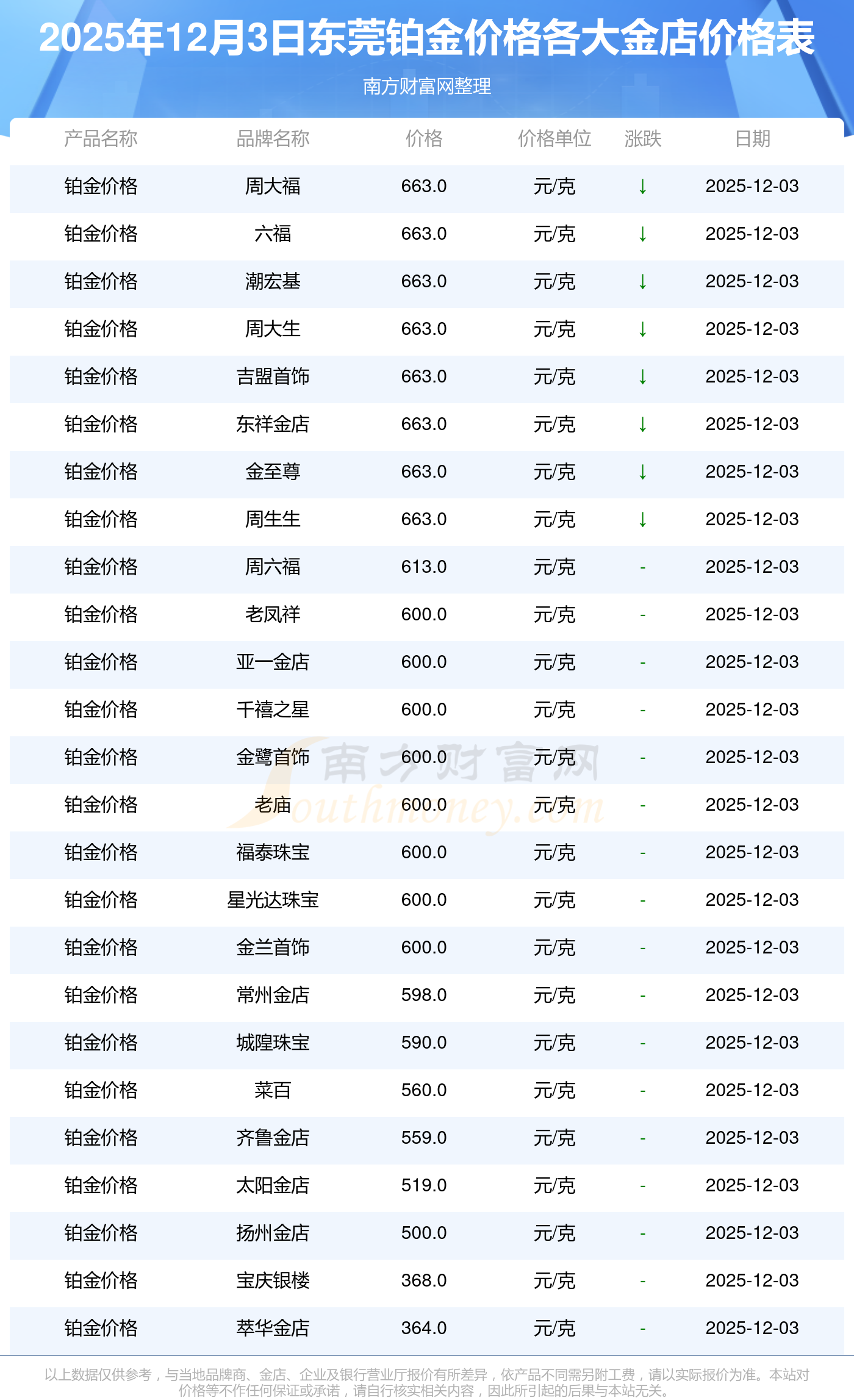 今天是2025年12月3日,東莞周大福、周大福、周大福、周大福、周大福、周大福、周大福、老鳳祥、老鳳祥、老鳳祥、六福等各大金店品牌鉑金價(jià)格最新價(jià)格如下:周大福1328.0元/克、周大福663.0元/克、周大福1328.0元/克、周大福46770.0、周大福18990.0、周大福42190.0、周大福1165.0元/克、老鳳祥1327.0元/克、老鳳祥600.0元/克、老鳳祥1327.0元/克、六福1326.0元/克。