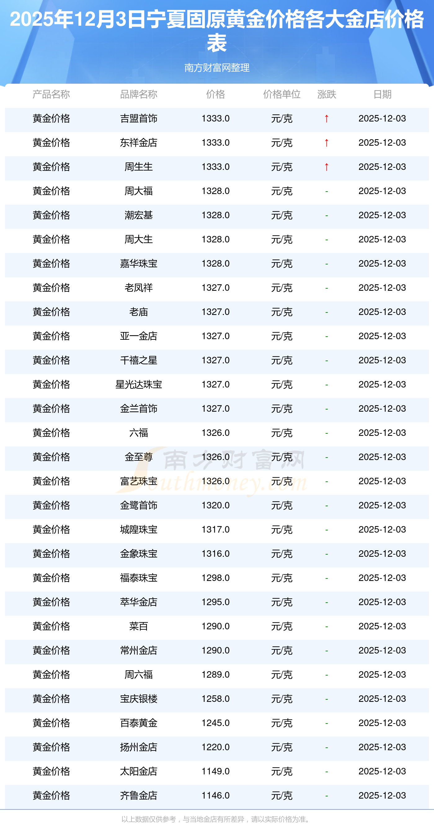 2025年12月3日,寧夏固原周大福、周大福、周大福、周大福、周大福、周大福、周大福、老鳳祥、老鳳祥、老鳳祥、六福等各大金店品牌黃金價(jià)格今日價(jià)格如下:周大福1328.0元/克、周大福663.0元/克、周大福1328.0元/克、周大福46770.0、周大福18990.0、周大福42190.0、周大福1165.0元/克、老鳳祥1327.0元/克、老鳳祥600.0元/克、老鳳祥1327.0元/克、六福1326.0元/克。