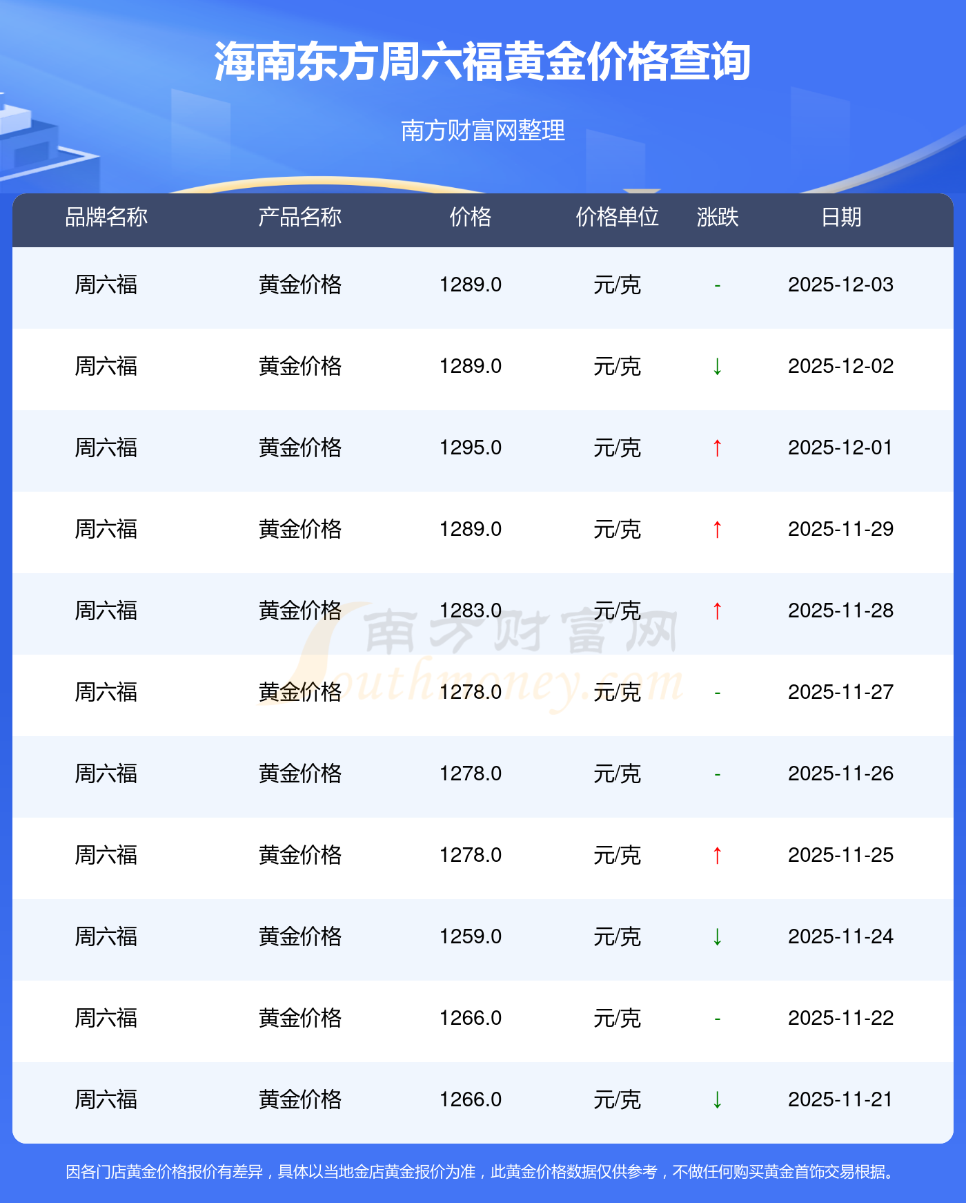 (2025年12月3日)海南東方周六福黃金價(jià)格現(xiàn)在為1289.0元/克。