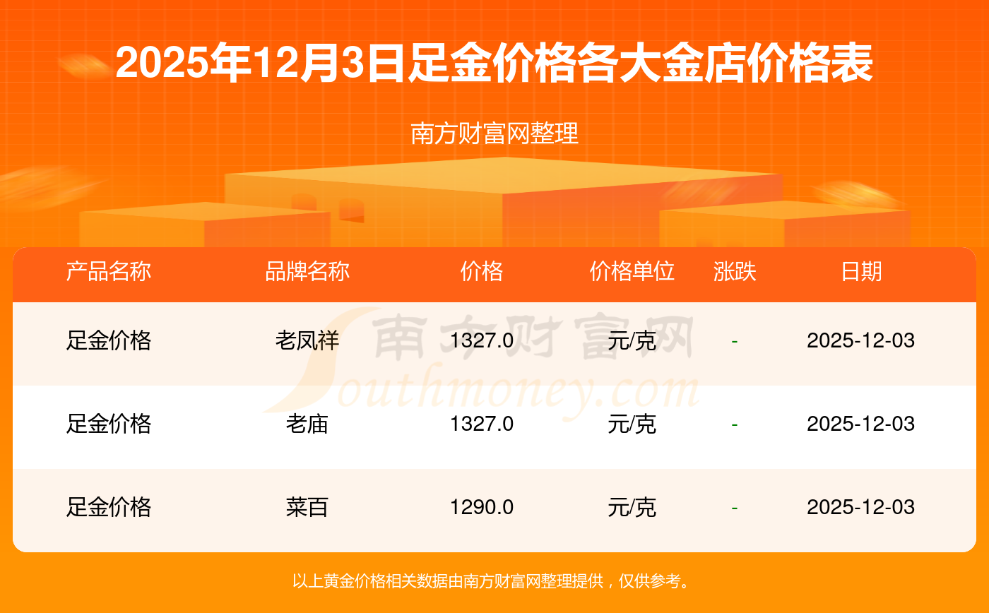 今天是2025年12月3日,周大福、周大福、周大福、周大福、周大福、周大福、周大福、老鳳祥、老鳳祥、老鳳祥、六福等各大金店品牌足金價(jià)格最新價(jià)格如下:周大福1328.0元/克、周大福663.0元/克、周大福1328.0元/克、周大福46770.0、周大福18990.0、周大福42190.0、周大福1165.0元/克、老鳳祥1327.0元/克、老鳳祥600.0元/克、老鳳祥1327.0元/克、六福1326.0元/克。
