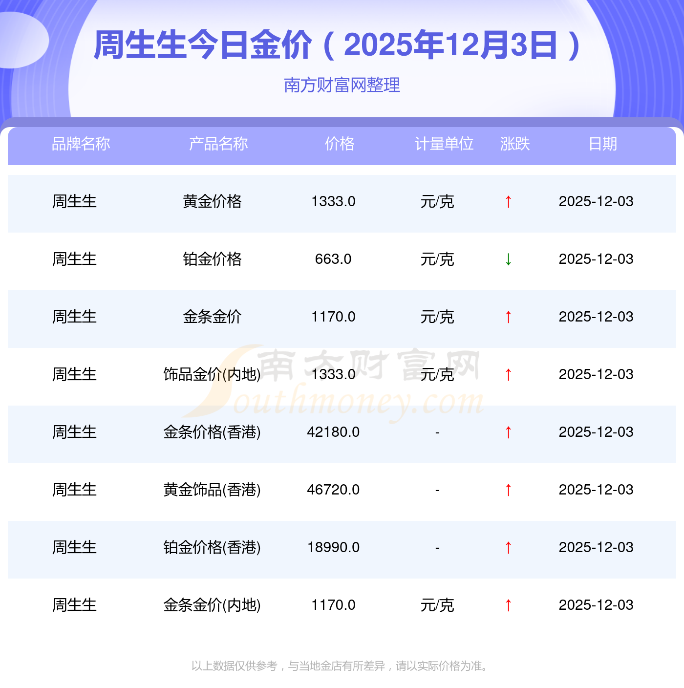 2025年12月3日周生生今日價格:黃金價格1328.0元/克,鉑金價格663.0元/克,飾品金價(內(nèi)地)1328.0元/克,黃金飾品(香港)46770.0,鉑金價格(香港)18990.0,金條價格(香港)42190.0,金條金價(內(nèi)地)1165.0元/克,黃金價格1327.0元/克,鉑金價格600.0元/克,足金價格1327.0元/克,黃金價格1326.0元/克。