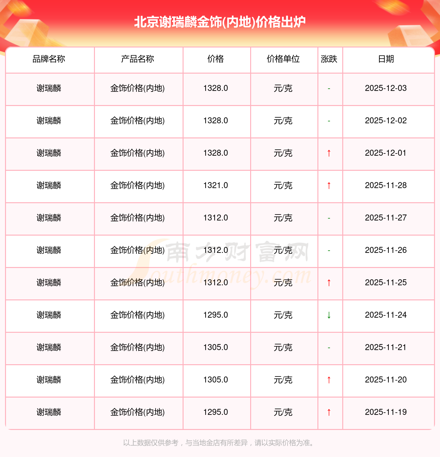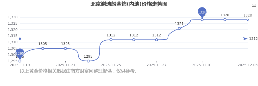 今日(2025年12月3日),北京謝瑞麟金飾價格(內(nèi)地)的價格是1328.0元/克。