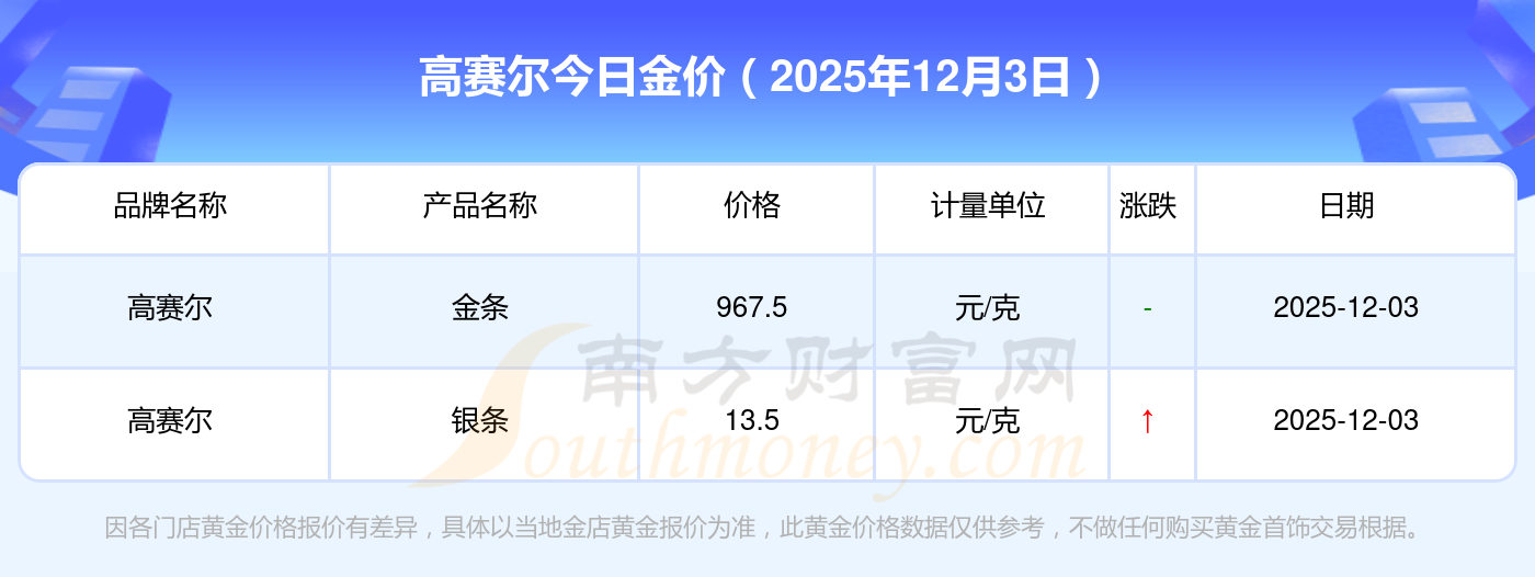 2025年12月3日高賽爾最新價(jià)格:黃金價(jià)格1328.0元/克,鉑金價(jià)格663.0元/克,飾品金價(jià)(內(nèi)地)1328.0元/克,黃金飾品(香港)46770.0,鉑金價(jià)格(香港)18990.0,金條價(jià)格(香港)42190.0,金條金價(jià)(內(nèi)地)1165.0元/克,黃金價(jià)格1327.0元/克,鉑金價(jià)格600.0元/克,足金價(jià)格1327.0元/克,黃金價(jià)格1326.0元/克。