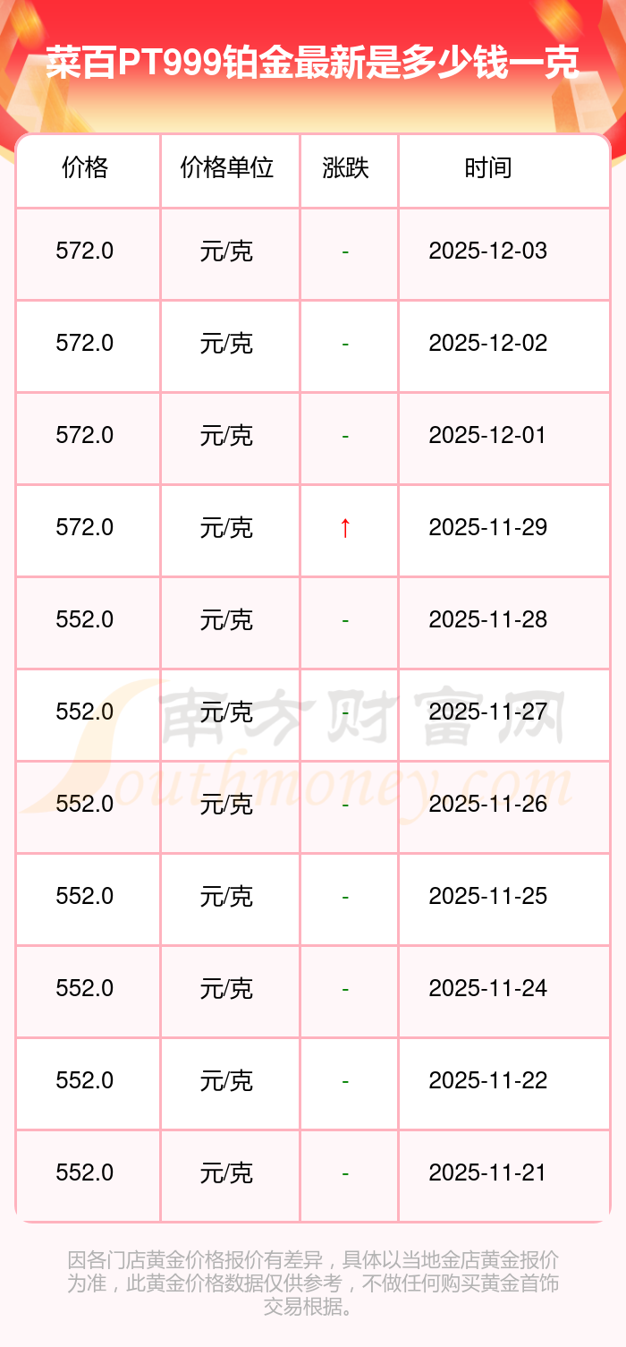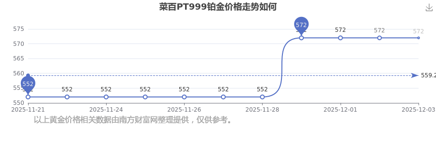 據(jù)了解,今日菜百 PT999鉑金的最新價格為572.0元/克。