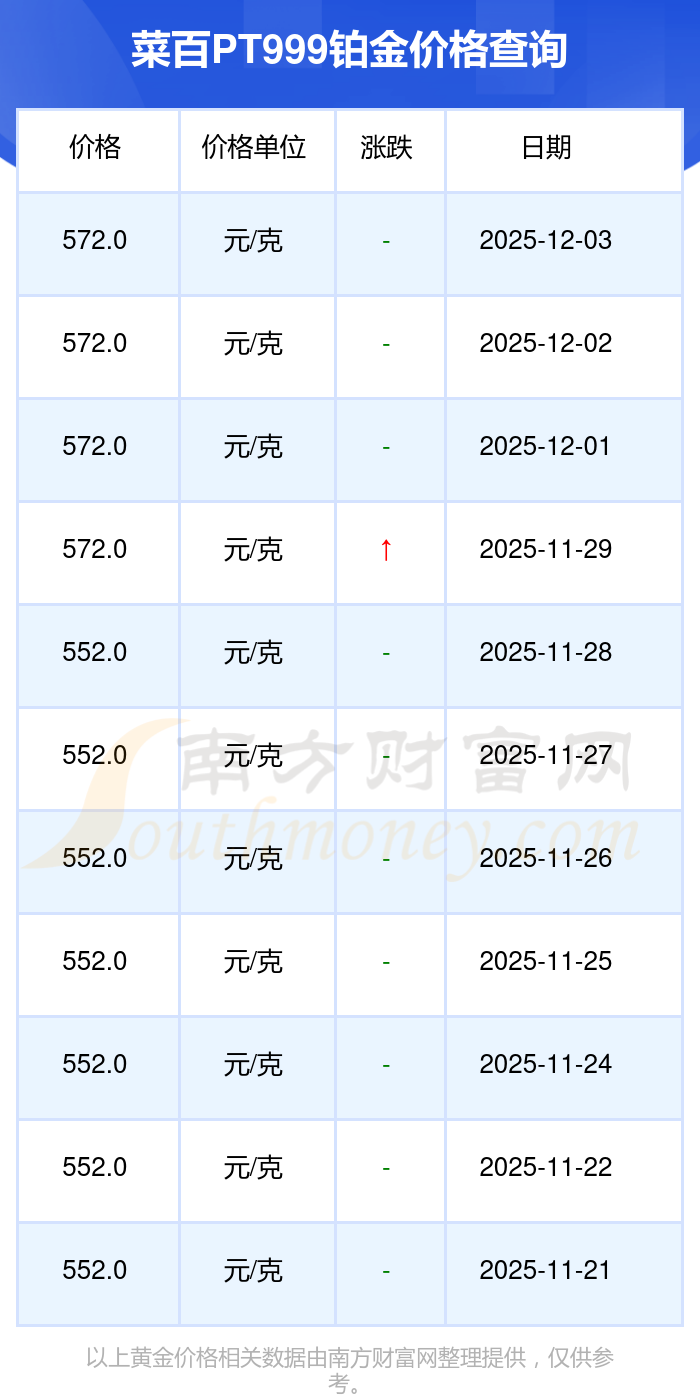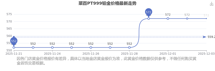 今日菜百PT999鉑金價格最新查詢:572.0元/克。