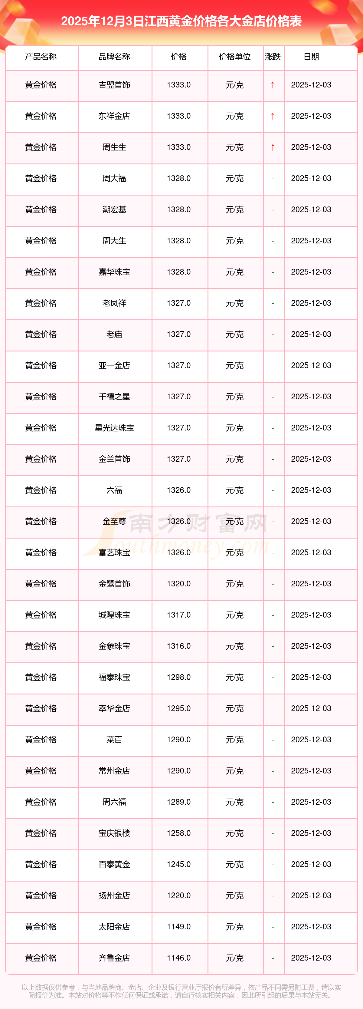 今天是2025年12月3日,江西周大福、周大福、周大福、周大福、周大福、周大福、周大福、老鳳祥、老鳳祥、老鳳祥、六福等各大金店品牌黃金價格最新價格如下:周大福1328.0元/克、周大福663.0元/克、周大福1328.0元/克、周大福46770.0、周大福18990.0、周大福42190.0、周大福1165.0元/克、老鳳祥1327.0元/克、老鳳祥600.0元/克、老鳳祥1327.0元/克、六福1326.0元/克。