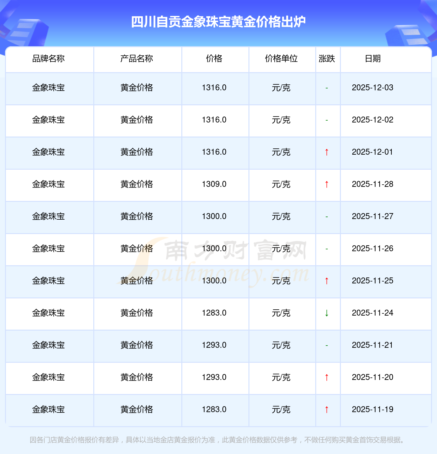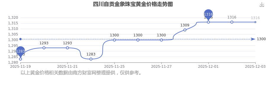 今日四川自貢金象珠寶黃金價(jià)格是1316.0元/克。