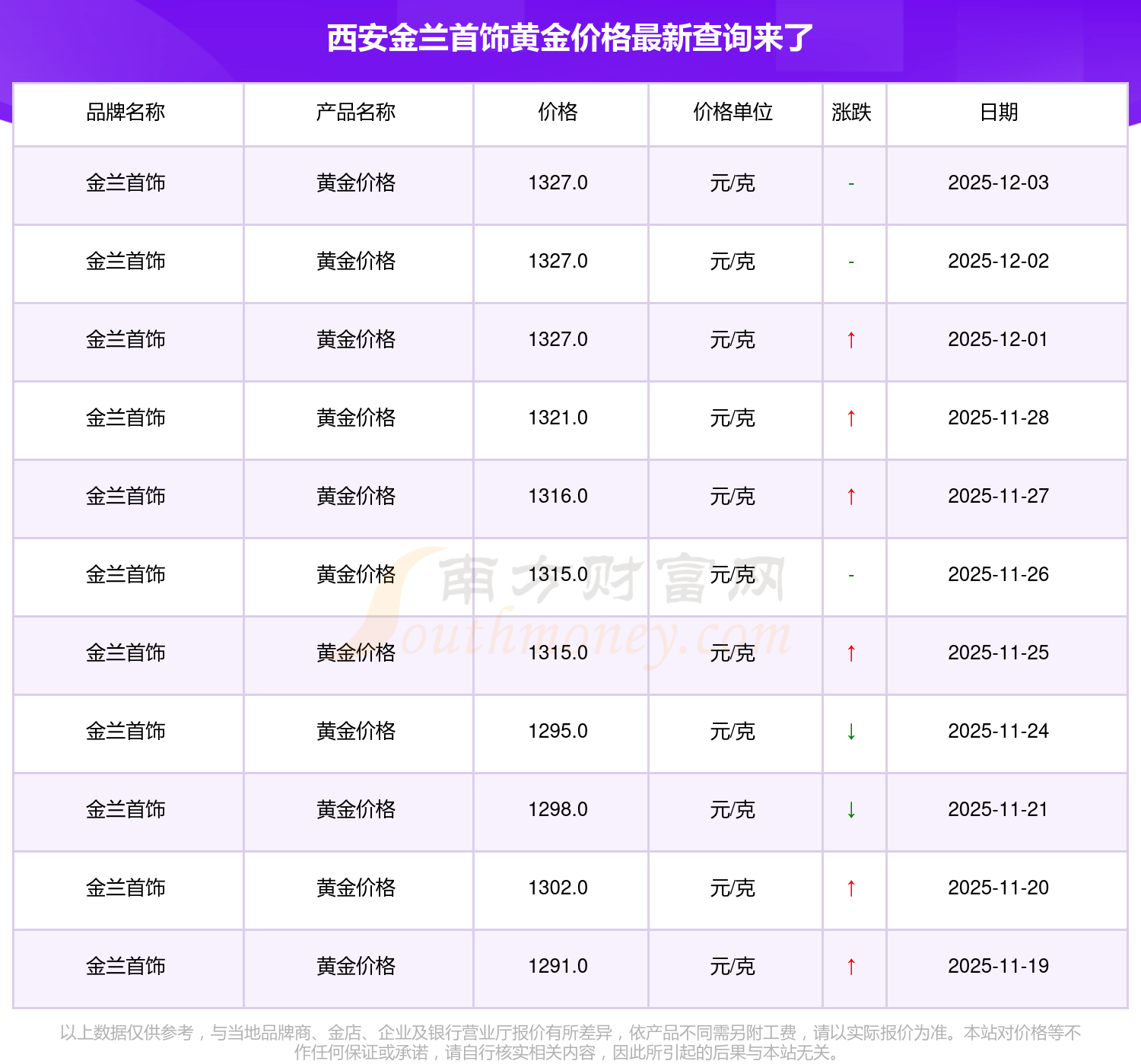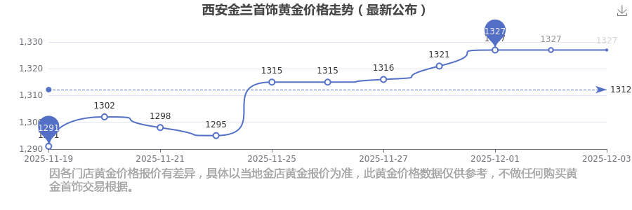 (2025年12月3日)西安金蘭首飾黃金價(jià)格現(xiàn)在為1327.0元/克。