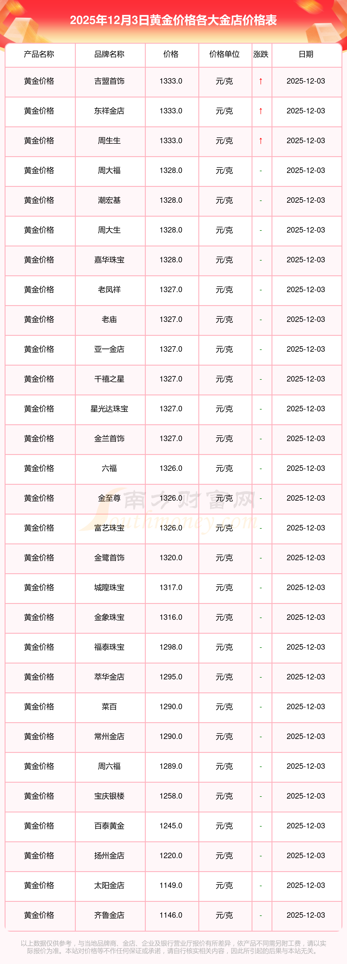 今天是2025年12月3日,周大福、周大福、周大福、周大福、周大福、周大福、周大福、老鳳祥、老鳳祥、老鳳祥、六福等各大金店品牌黃金價(jià)格最新價(jià)格如下:周大福1328.0元/克、周大福663.0元/克、周大福1328.0元/克、周大福46770.0、周大福18990.0、周大福42190.0、周大福1165.0元/克、老鳳祥1327.0元/克、老鳳祥600.0元/克、老鳳祥1327.0元/克、六福1326.0元/克。