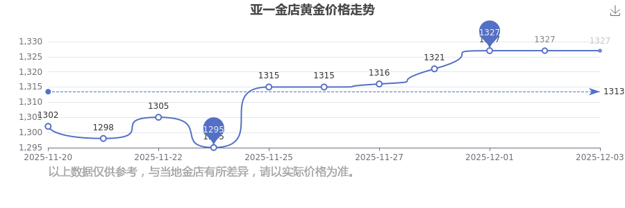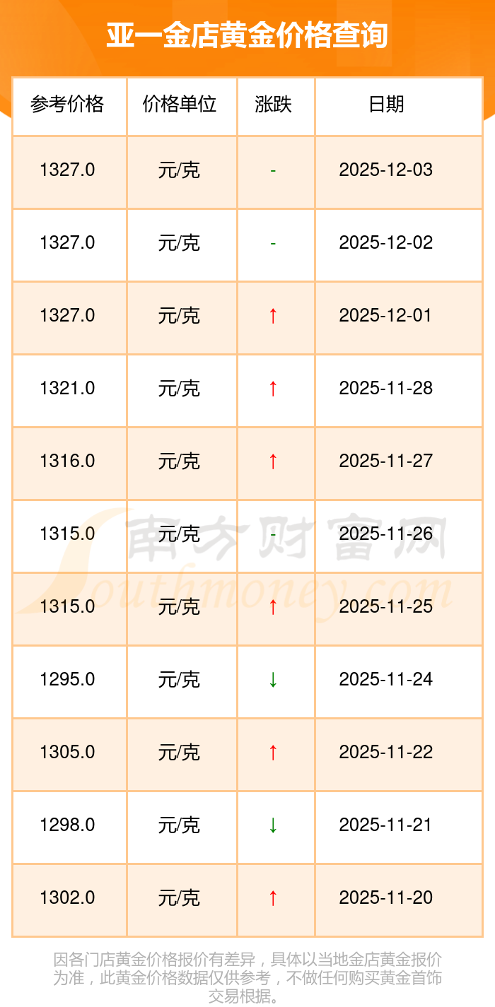 今天黃金價(jià)格行情如何?現(xiàn)在一克黃金的售價(jià)是多少?黃金每一克的價(jià)錢一般是多少呀?今日(2025年12月4日),亞一金店黃金價(jià)格最新價(jià)格為1327.0元/克。