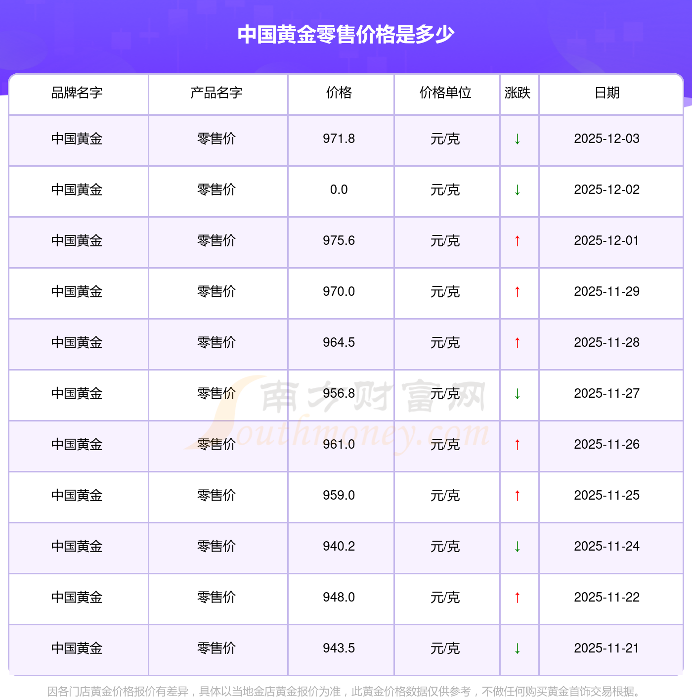 今日中國黃金零售價格為971.8元/克。