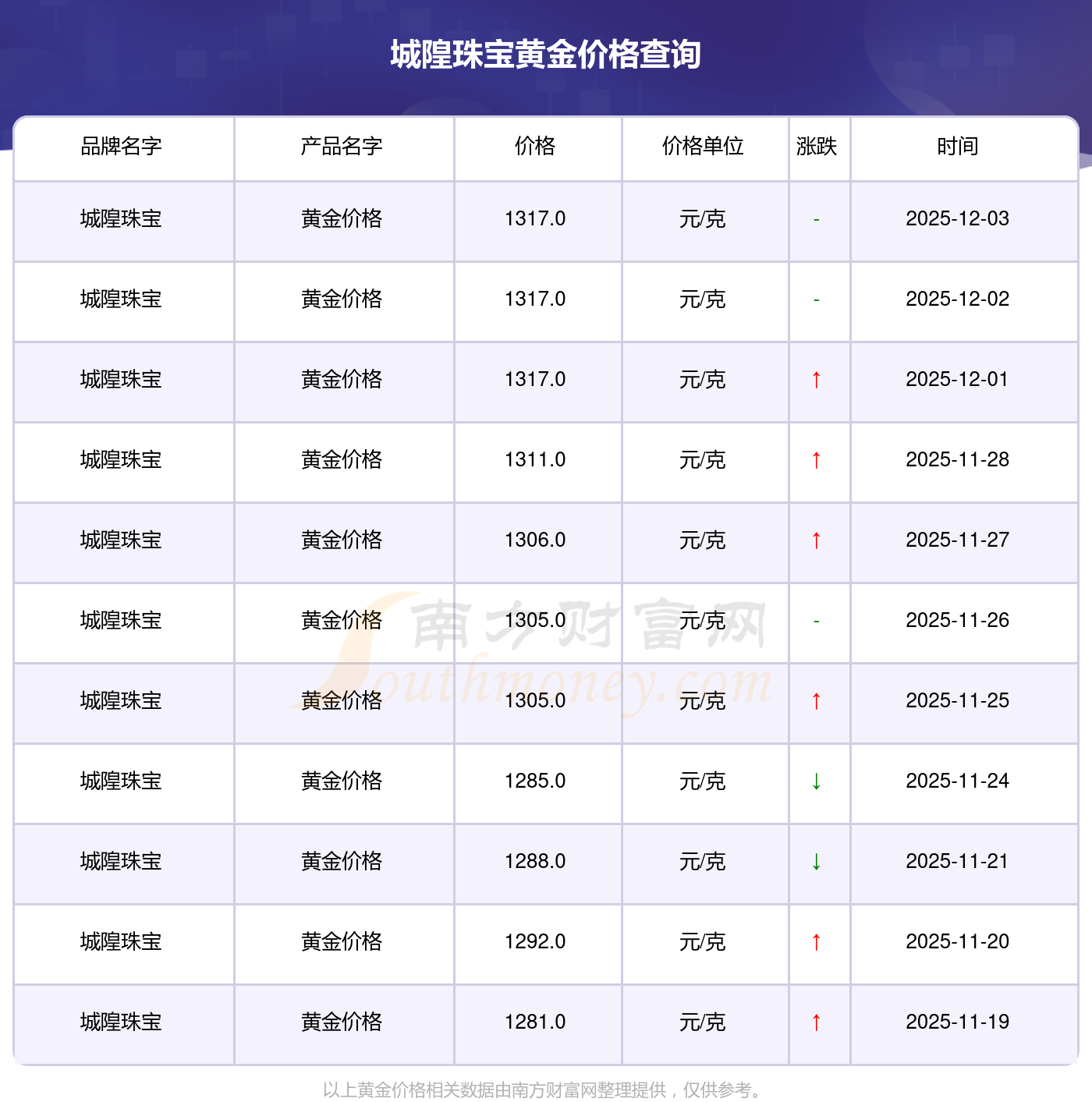 今天黃金價(jià)位怎樣?當(dāng)下一克黃金的價(jià)格為多少?黃金每克的價(jià)錢通常來(lái)說(shuō)是多少左右?城隍珠寶今日黃金價(jià)格的最新標(biāo)價(jià)為1317.0元/克。