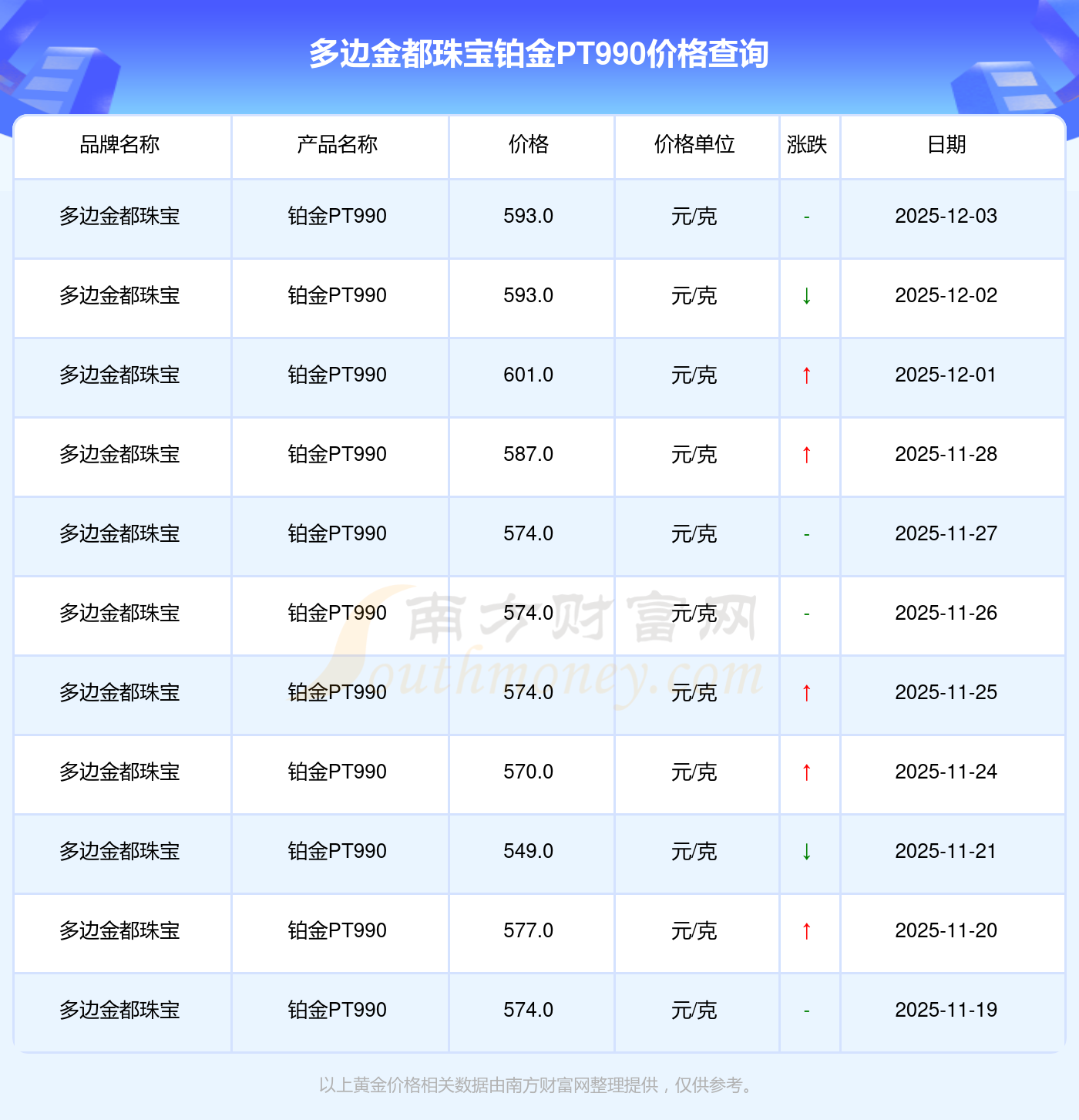 今日(2025年12月4日),多邊金都珠寶鉑金PT990價格:593.0元/克。