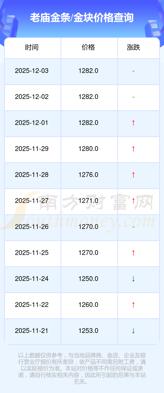 今日老廟 金條/金塊價(jià)格最新的市場標(biāo)價(jià)為1282.0元/克。