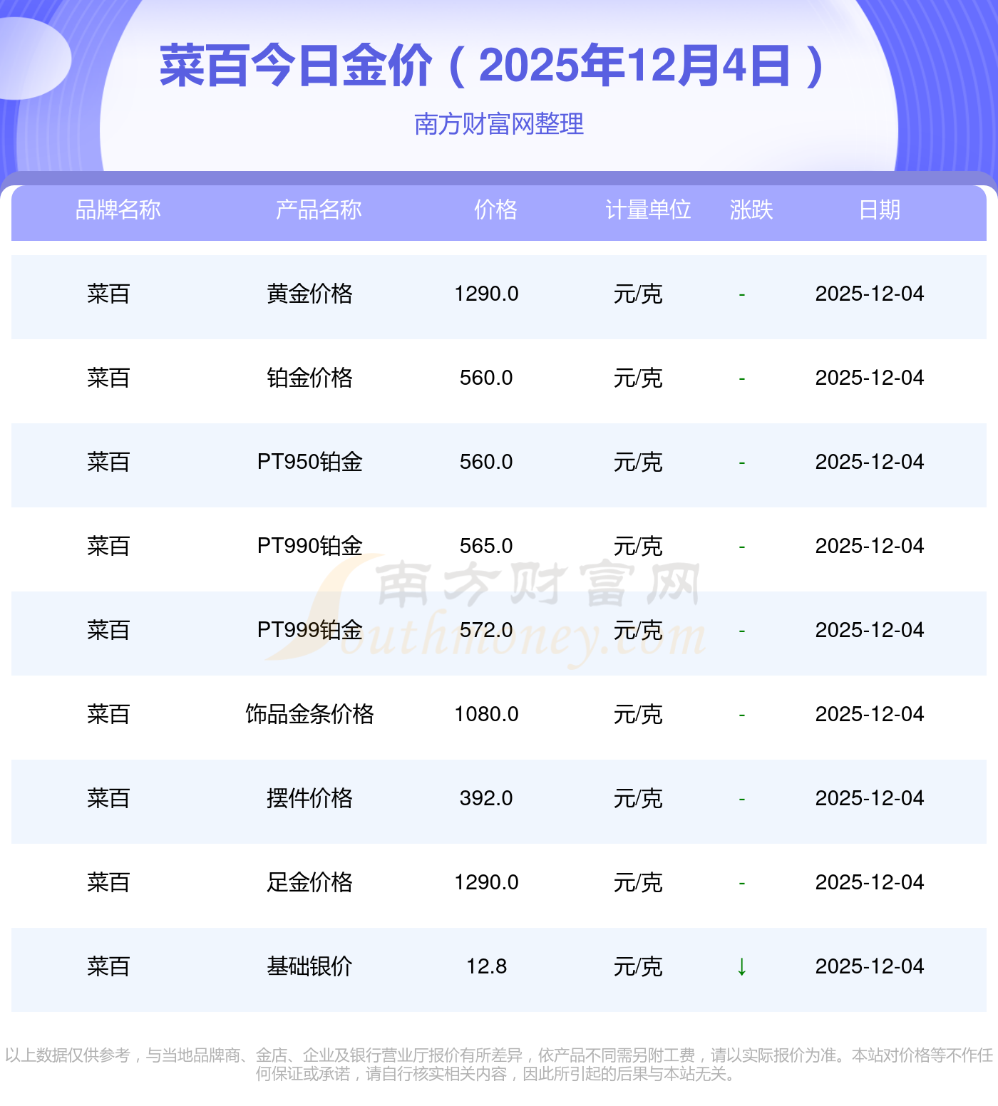 2025年12月4日菜百最新價格:黃金價格1328.0元/克,鉑金價格671.0元/克,飾品金價(內(nèi)地)1328.0元/克,黃金飾品(香港)46730.0,鉑金價格(香港)19260.0,金條價格(香港)42160.0,金條金價(內(nèi)地)1165.0元/克,黃金價格1325.0元/克,鉑金價格600.0元/克,足金價格1325.0元/克,黃金價格1326.0元/克。