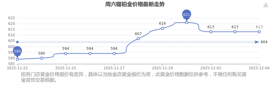 今日(2025年12月4日)周六福鉑金價(jià)格的價(jià)格為613.0元/克。