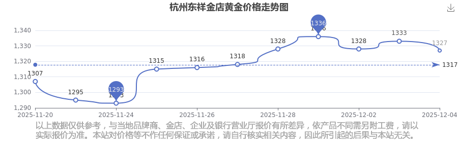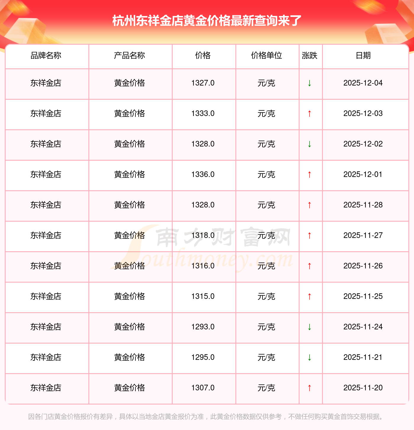 2025年12月4日,杭州東祥金店的黃金價格標(biāo)價達(dá)到 1327.0元/克。