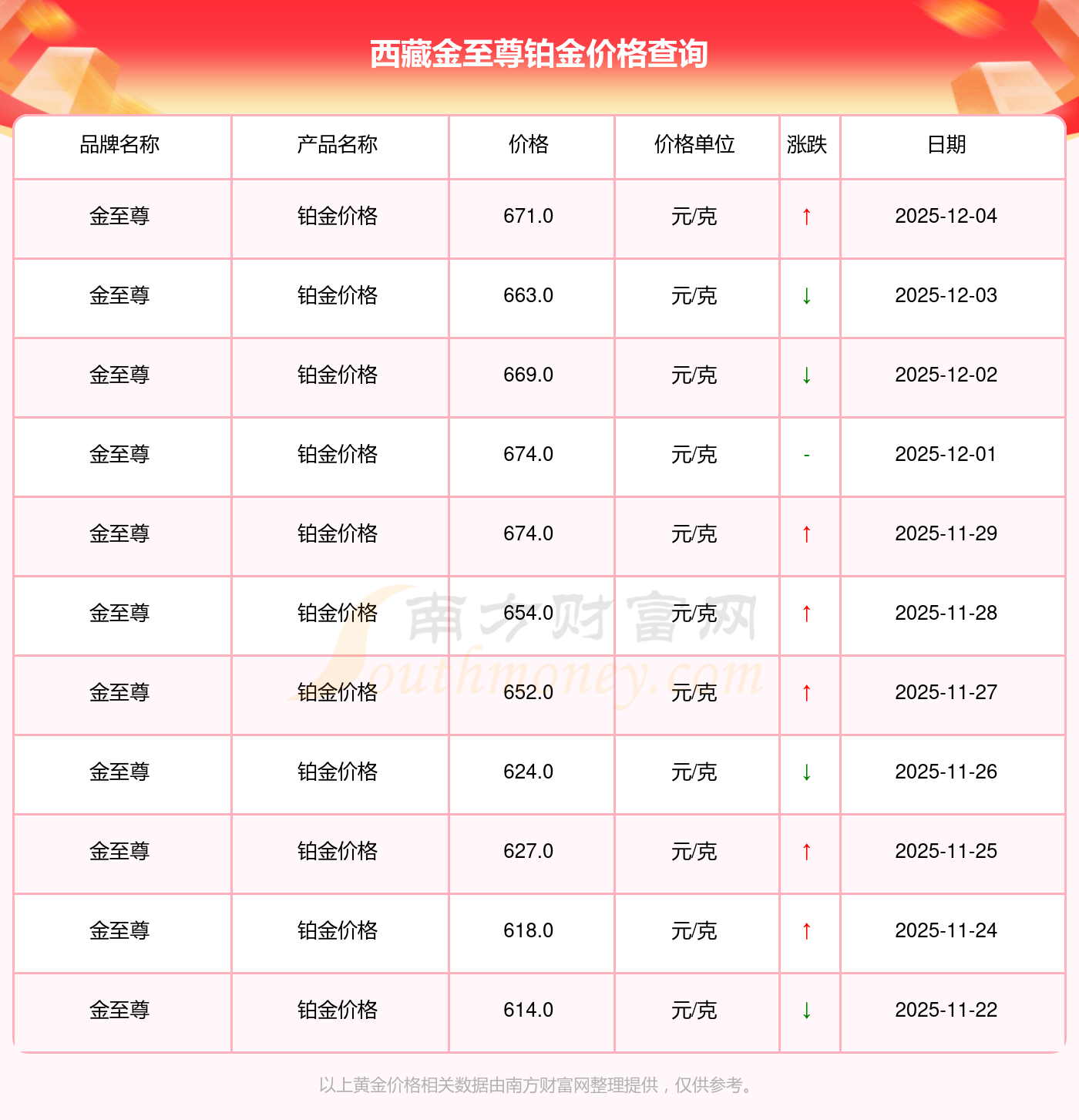 2025年12月4日當天,西藏金至尊鉑金價格的單價是 671.0元/克。