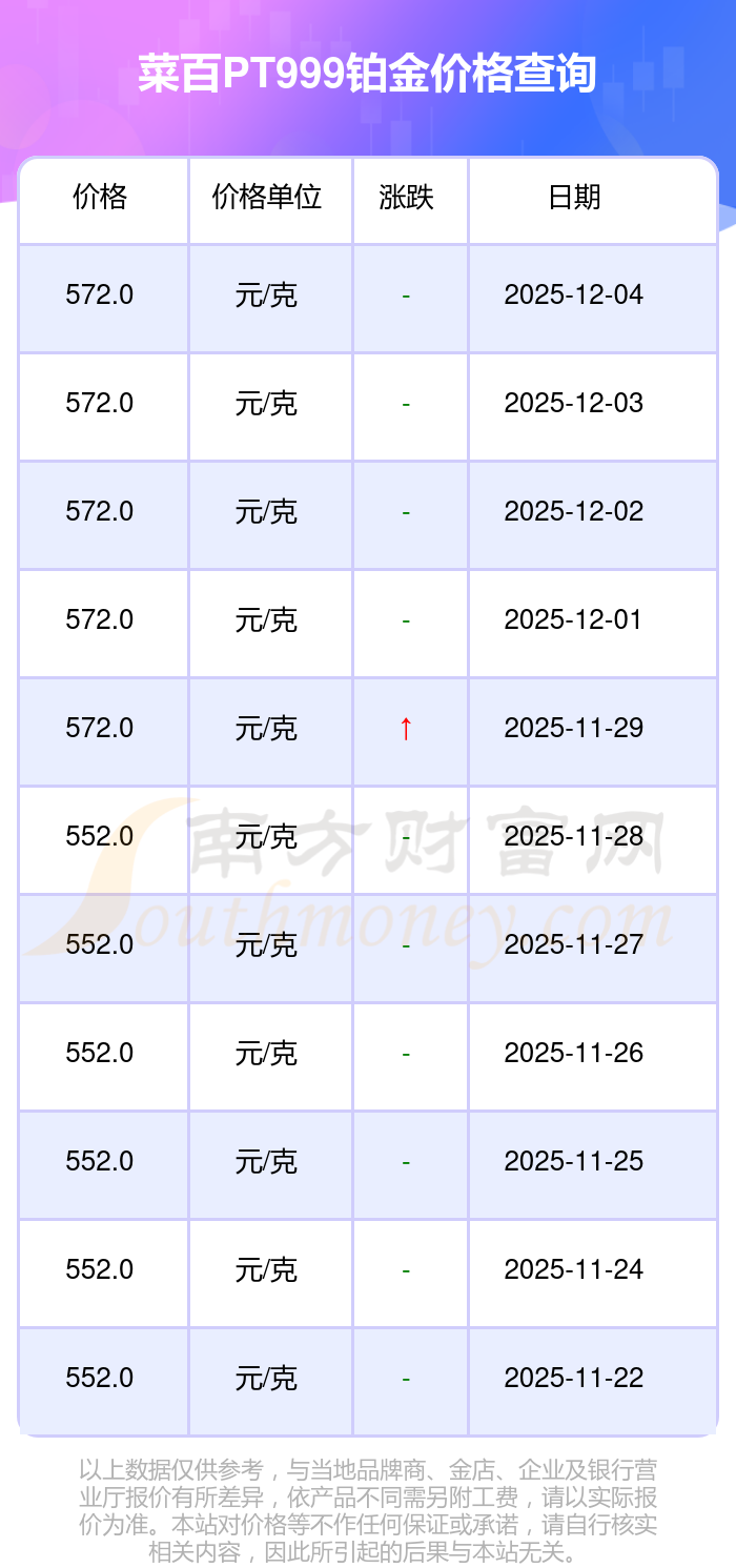 今日(2025年12月4日),菜百PT999鉑金最新價(jià)格為572.0元/克。