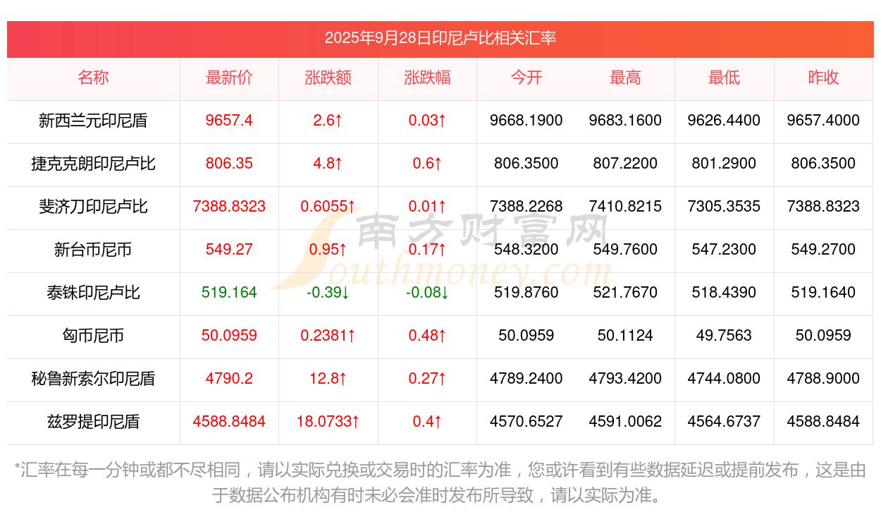 根據(jù)2025年9月28日匯率計算,IDR兌換BRL匯率最新價0.000300:今開價0.0003,昨收價0.0003,最高價0.0003,最低價0.0003。