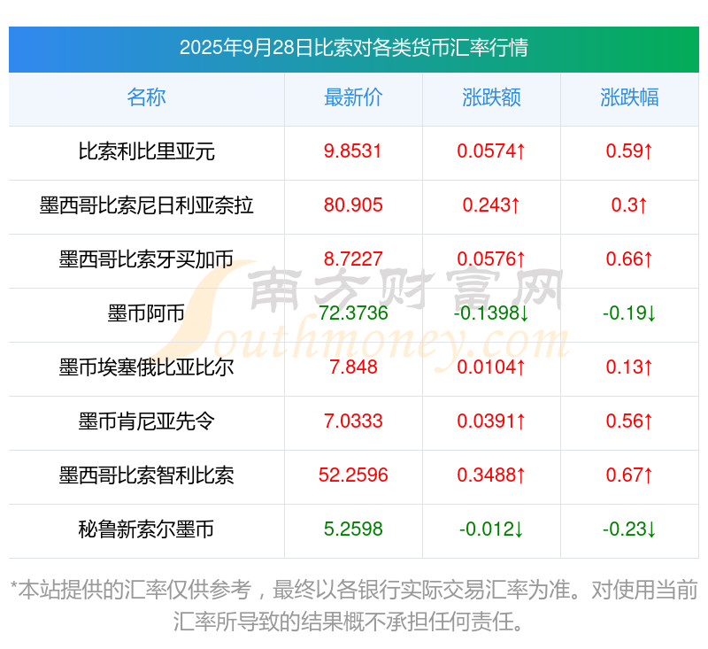 2025年9月28日最新消息,比索兌換馬來西亞幣最新匯率為0.229810,今開為0.2282,昨收為0.2298,最高為0.2303,最低為0.2276。