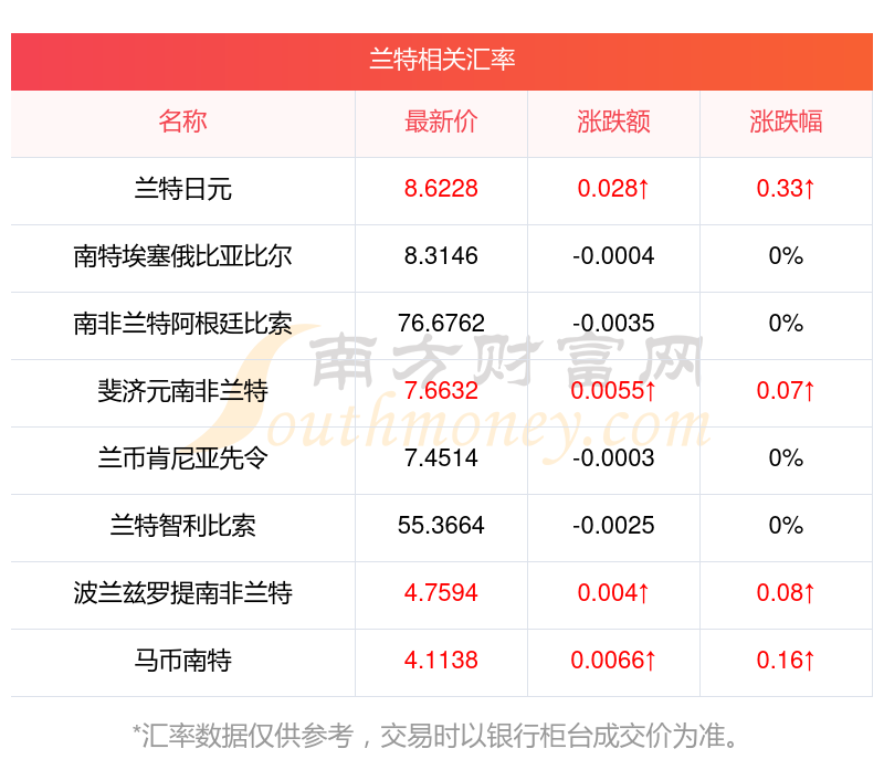 根據(jù)2025年9月29日匯率,蘭特兌換烏拉圭比索匯率最新價(jià)2.300254,今開(kāi)價(jià)2.2998,昨收價(jià)2.3001,最高價(jià)2.3017,最低價(jià)2.2935。