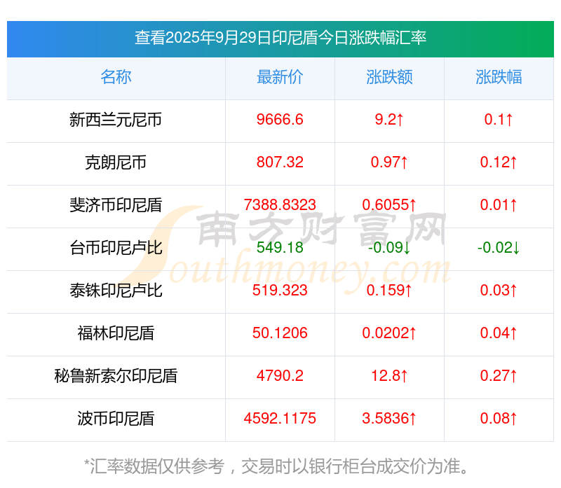 印尼盾對阿根廷比索匯率行情一覽表(2025年9月29日)