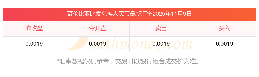 最新2025年11月9日哥倫比亞比索兌換人民幣匯率是:0.0019