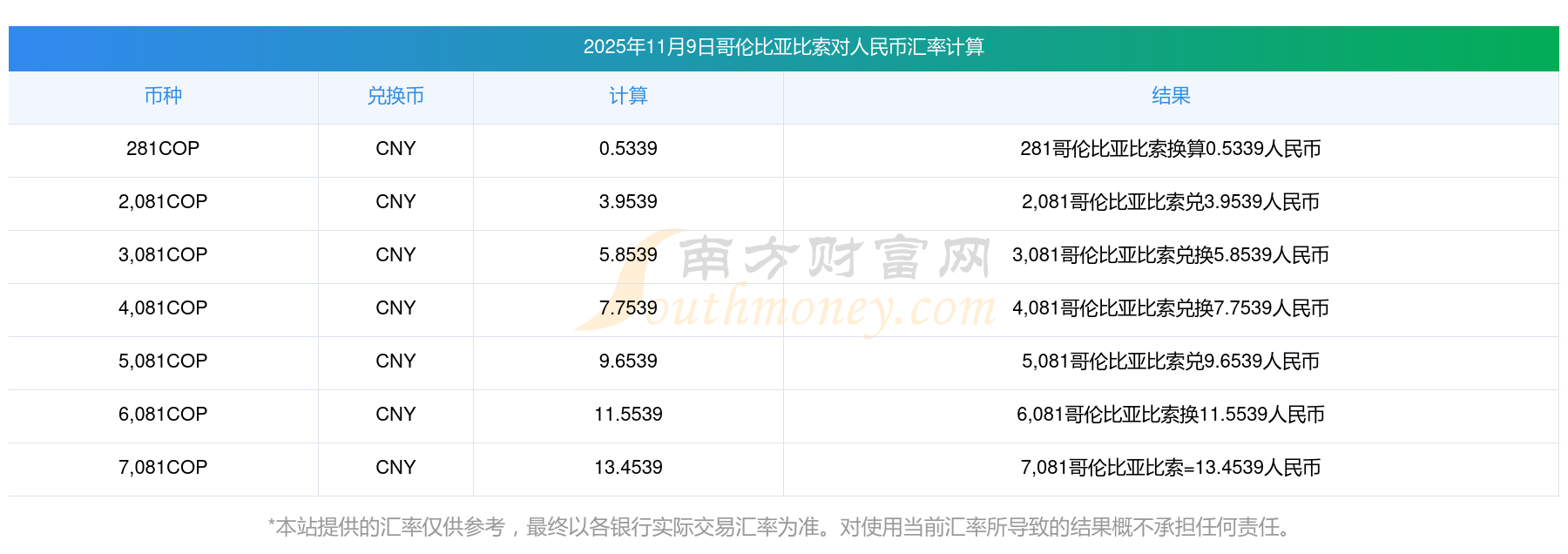 2025年11月9日行情:哥倫比亞比索兌換人民幣匯率查詢