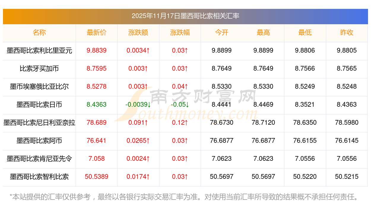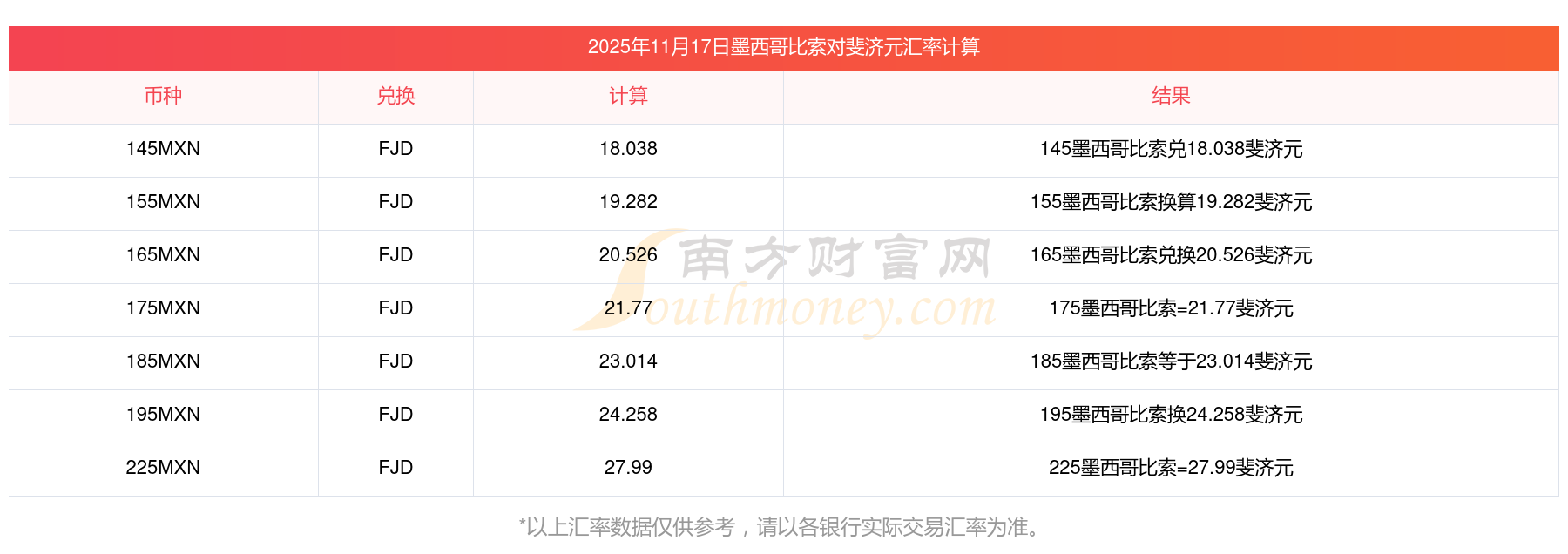 今天墨西哥比索兌斐濟(jì)元現(xiàn)鈔買入價多少(2025/11/17)