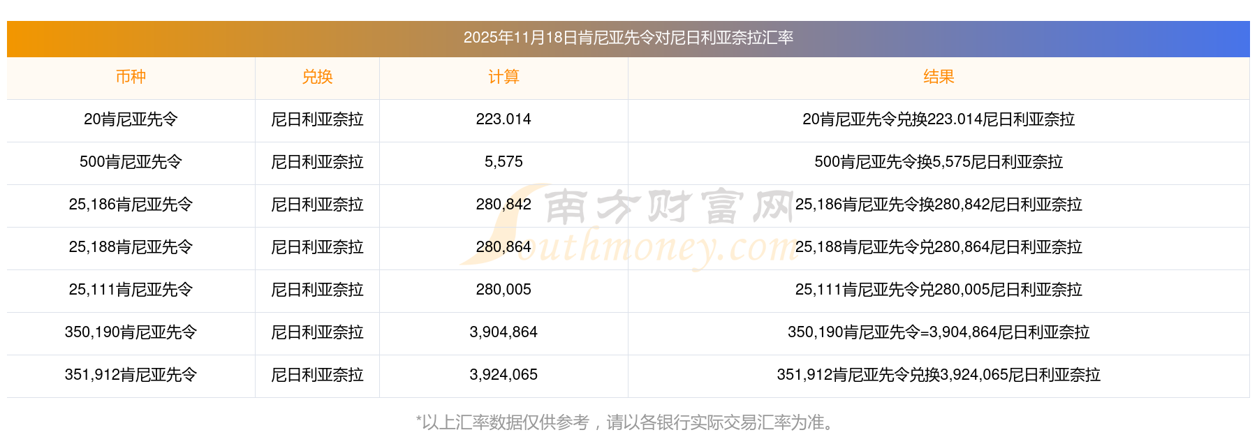 南方財(cái)富網(wǎng)為您提供肯尼亞先令對(duì)尼日利亞奈拉匯率最新價(jià)格詳情。