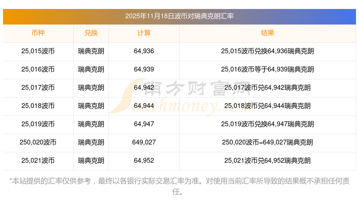 今日波幣兌換瑞典克朗價位表一覽(2025年11月18日)