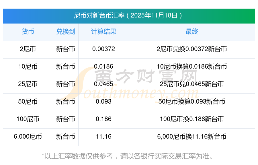 尼幣匯率:15尼幣兌新臺幣匯率查詢2025年11月18日