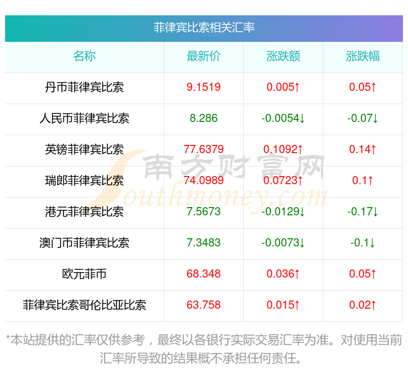 南方財富網(wǎng)為您提供菲律賓比索對哥倫比亞比索匯率最新價格詳情。