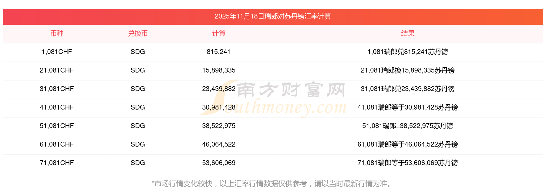 今日匯率查詢_瑞郎對蘇丹鎊匯率(2025年11月18日)