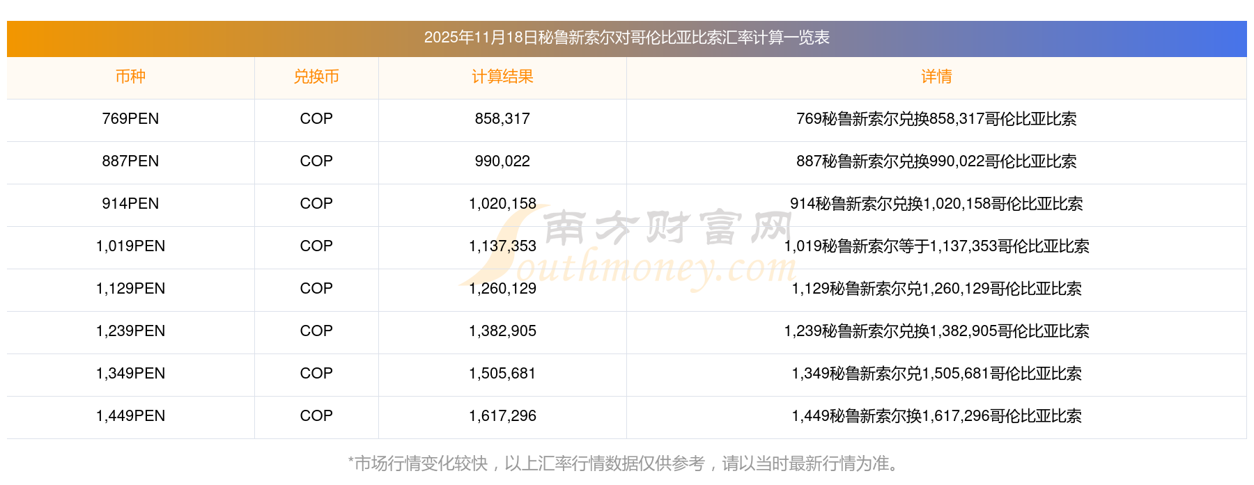 秘魯新索爾 兌 哥倫比亞比索 換算表2025年11月18日