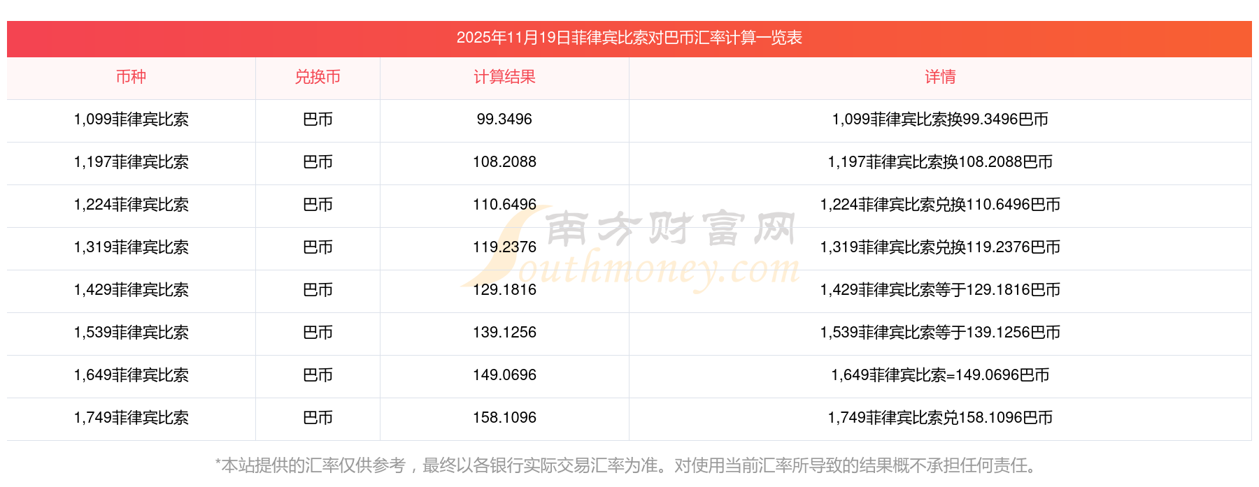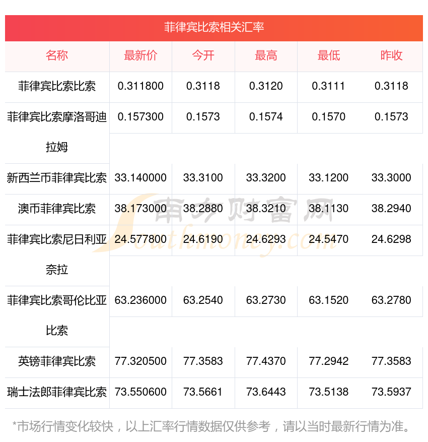 南方財(cái)富網(wǎng)為您提供菲律賓比索對(duì)巴幣匯率最新價(jià)格詳情。