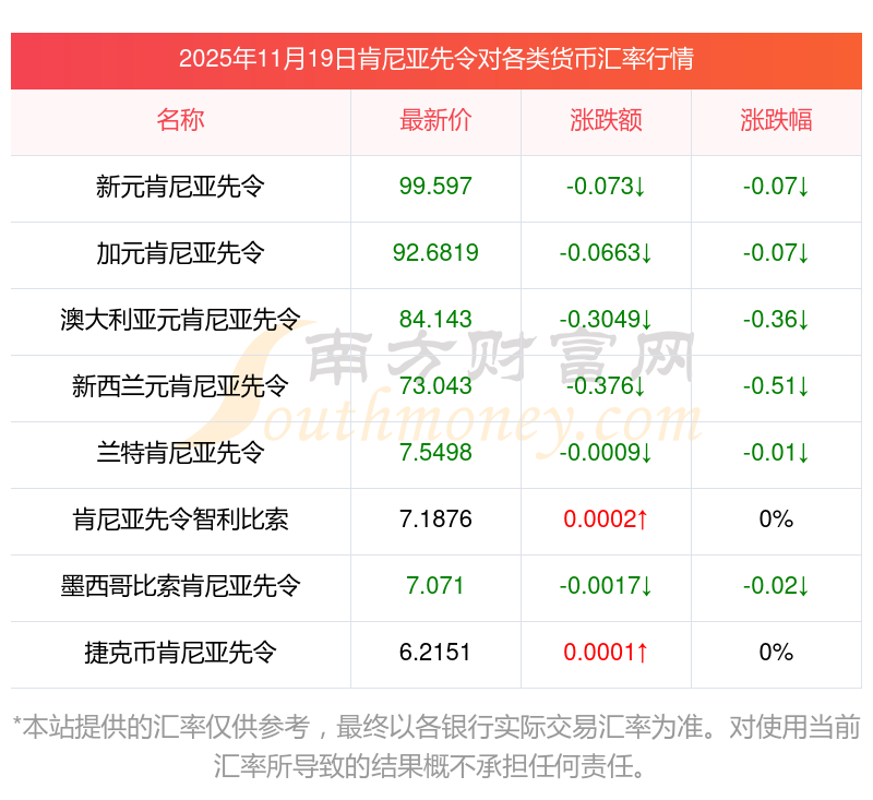 根據(jù)2025年11月19日匯率,肯尼亞先令兌換韓幣匯率最新價11.296000,今開價11.2480,昨收價11.2480,最高價11.3140,最低價11.2300。